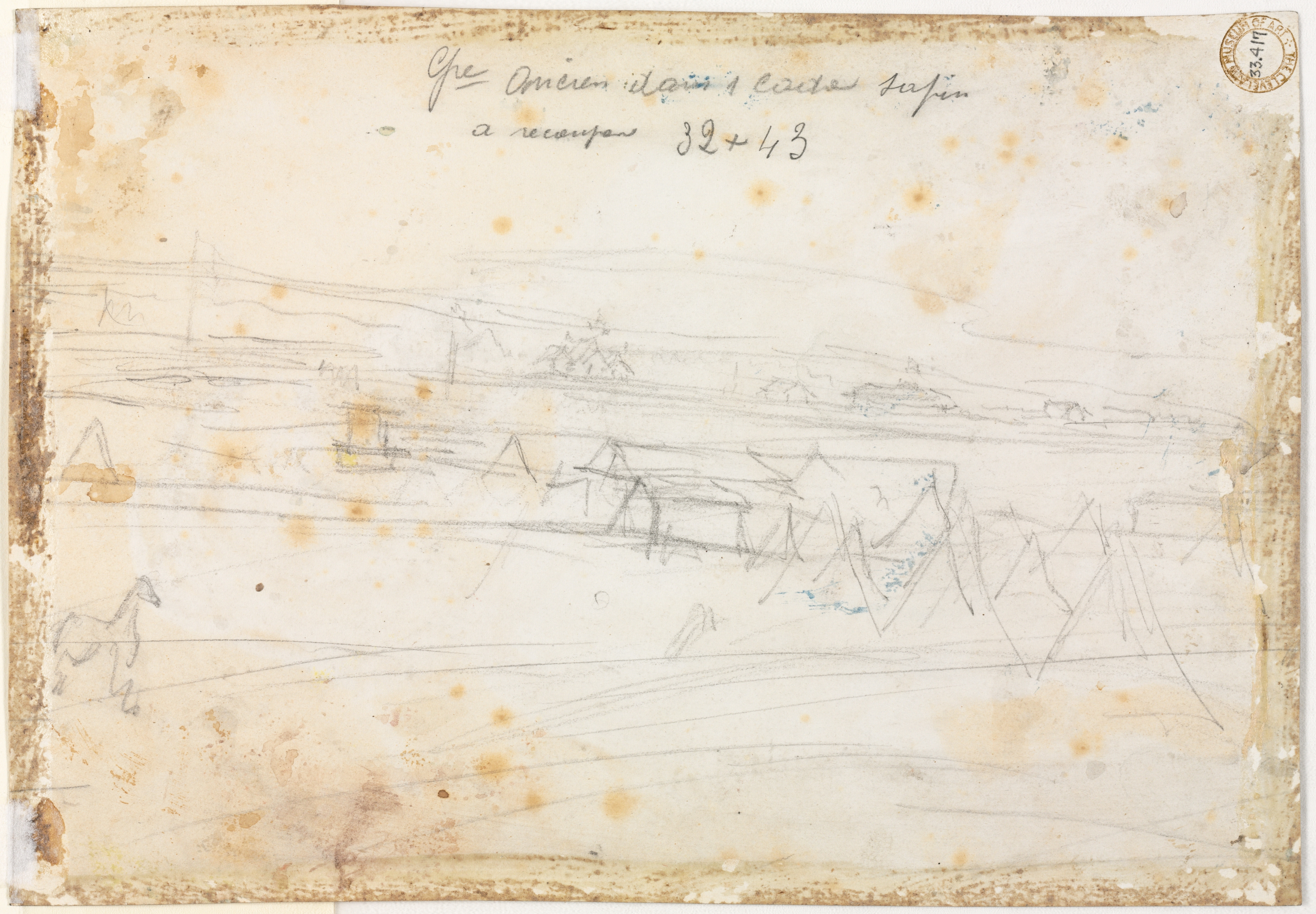 The image shows a sketch of a war encampment scene. The sketch is drawn on aged paper with brown spots and a darker brown border around the edges. The sketch depicts a landscape with several triangular shapes, likely representing tents, arranged in rows. A horse is drawn on the left side. The sketch is drawn in pencil. There is writing at the top in cursive. A circular stamp is in the top-right corner. The background of the image is white.