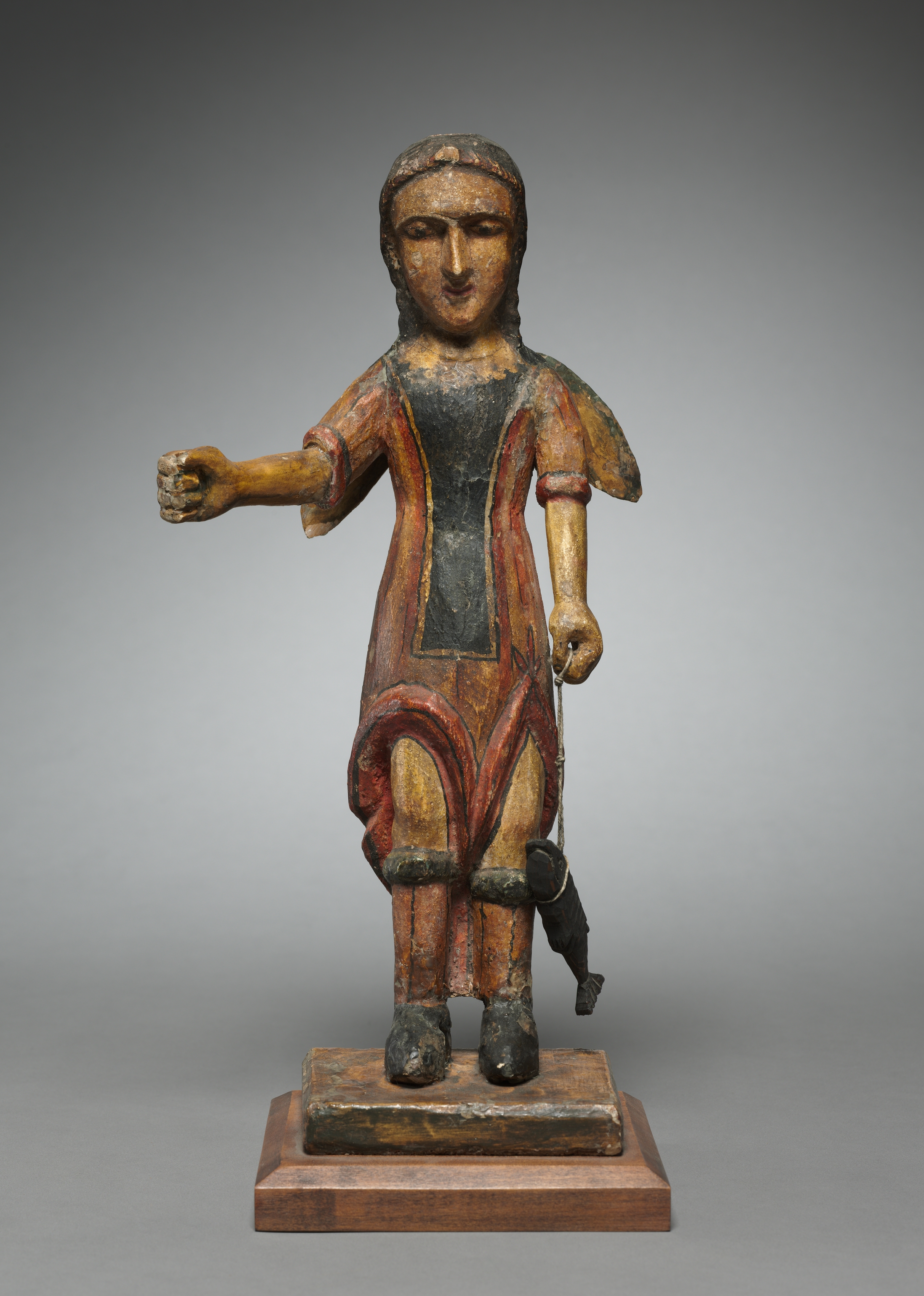 The statue depicts San Rafael Archangel, a santo de bulto. The figure has long hair and wears a dark shirt with a red and gold robe draped over it. The robe has a red design on the front. The figure wears black shoes. The right arm is outstretched with a small object in the hand. The left arm hangs down with the hand closed. The figure stands on a raised platform. The background fades from dark to light gray.