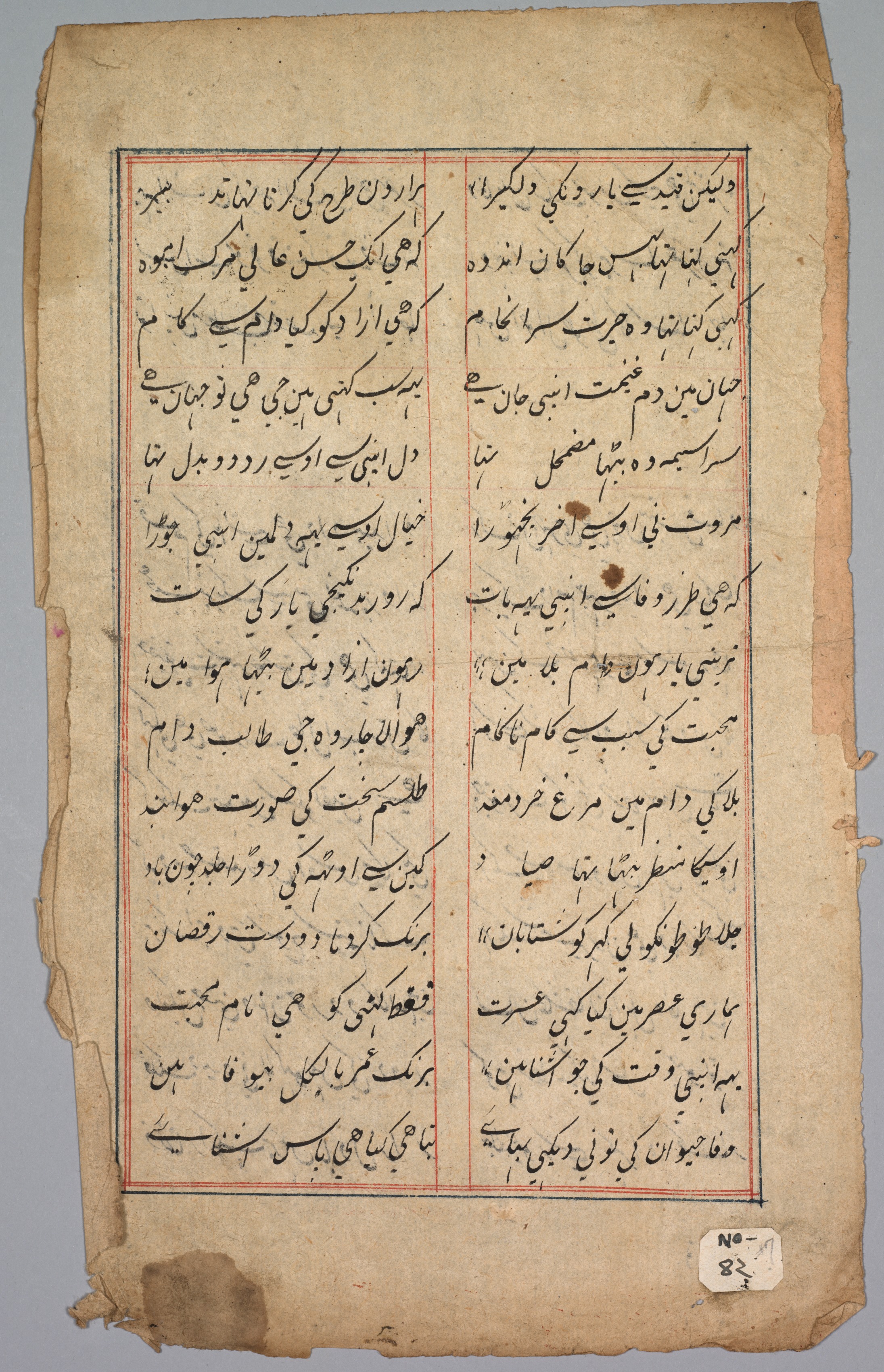 Aged, yellowed paper with rough, uneven edges and darker brown spots. The page is divided into two columns by a thin red line down the center. Each column contains black, handwritten text written in Persian script. A thin black border surrounds both columns. A small white sticker with black writing reading "No 82" is on the bottom right corner. The background behind the paper is gray.