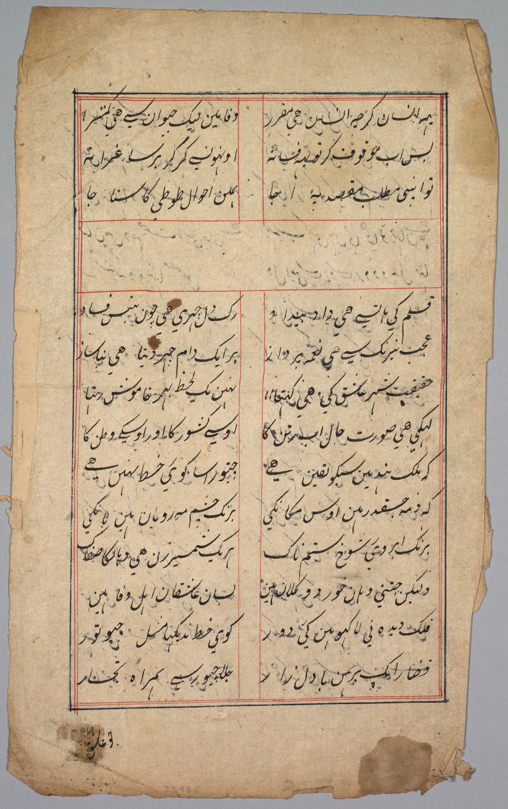 Yellowed, aged paper with rough edges and dark spots. Two red-lined columns of black Persian writing. The column on the left contains 32 lines of text. The column on the right contains 33 lines of text. Top and bottom margins are uneven. The page is divided into four sections by two vertical red lines and three horizontal red lines. Gray background visible around the edges of the paper. Title: Page with Two Columns of Persian Writing. Artist unknown.