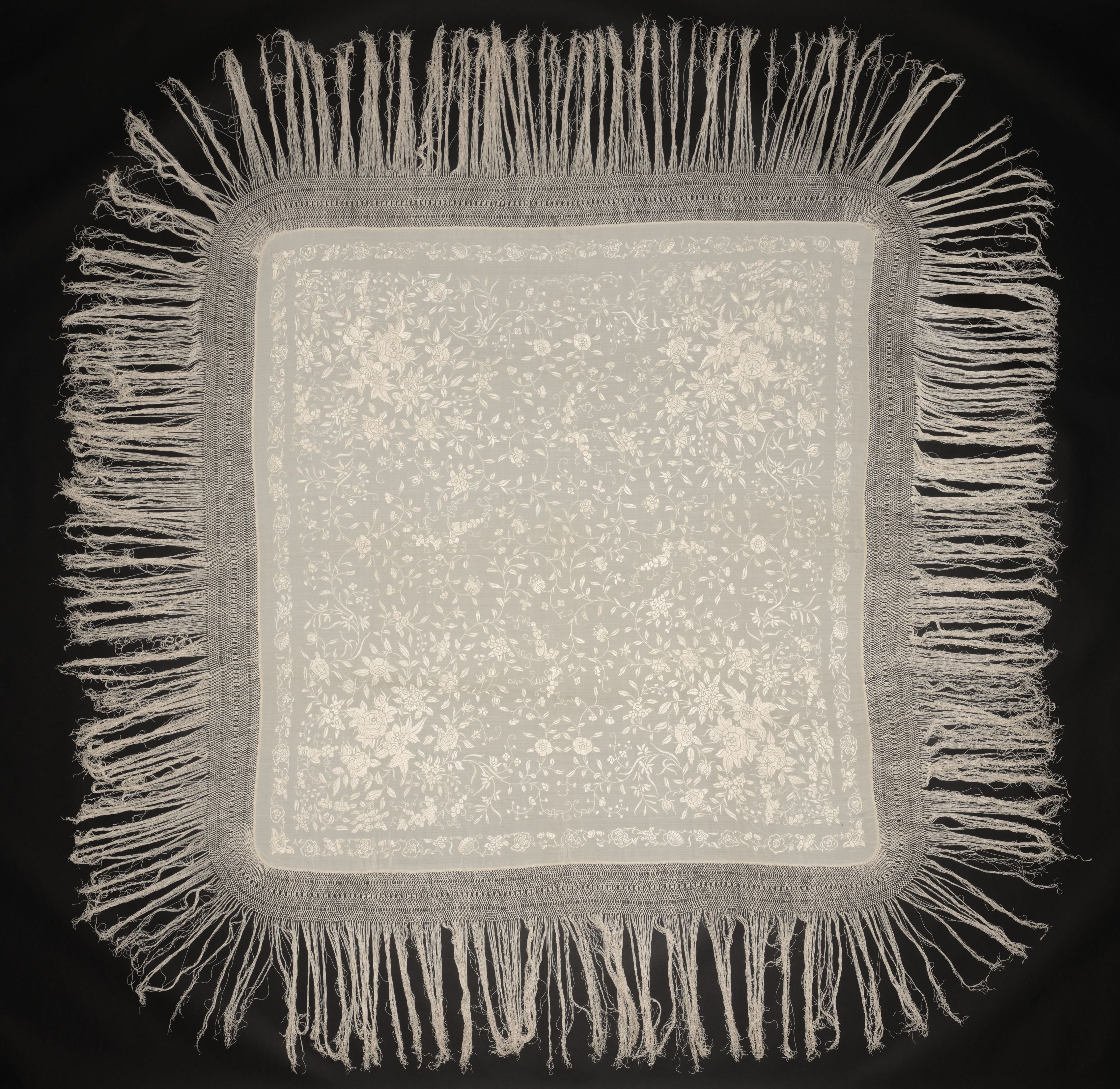 The image shows a square shawl with a fringe border, titled "Silk Shawl". The shawl is light gray with a floral pattern and a double-layered border. The inner border is a lighter shade of gray with a floral design and the outer border is a darker shade of gray. The shawl has long, thin fringe all around its edges. The fringe is made up of many individual threads that are roughly the same length. The background of the image is black.