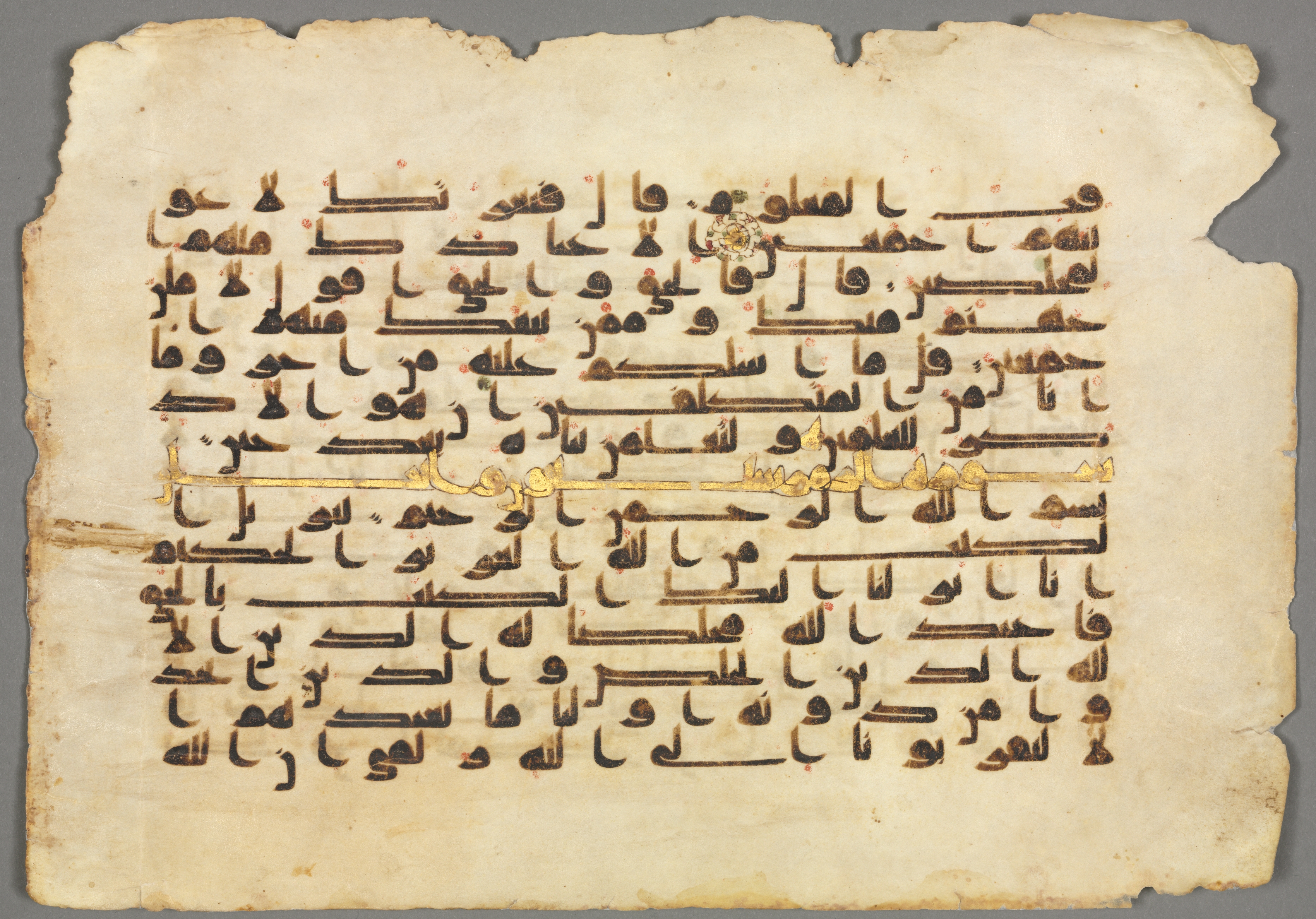 The image features a yellowed, aged parchment with Arabic calligraphy written in dark brown ink. The parchment's edges are rough and frayed. A central design element consists of a gold-colored floral motif. The text consists of 13 horizontal lines of text. A gold-colored line separates the fifth and sixth lines of text. Small red marks are scattered throughout the text. The background of the image is a solid gray color.