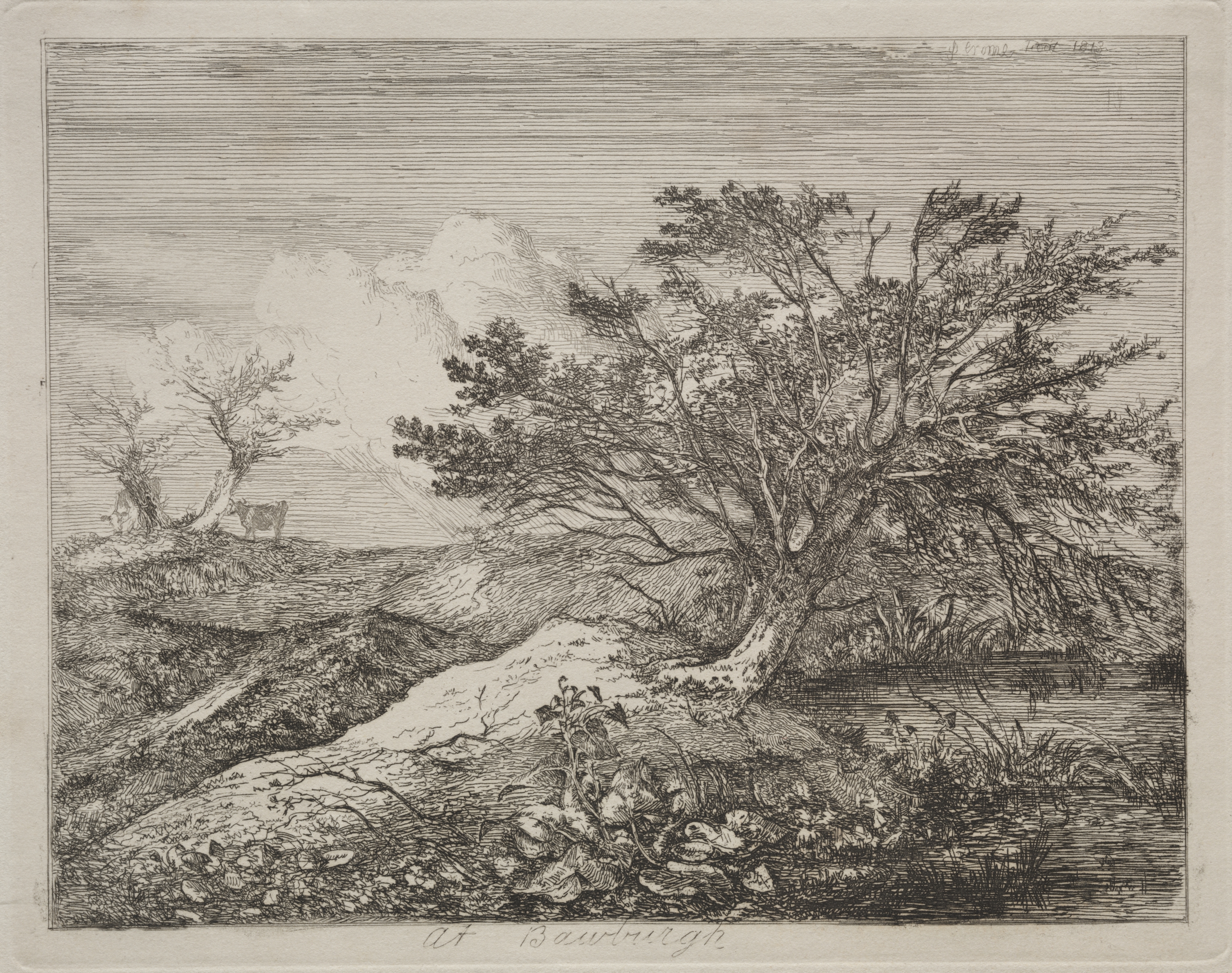 The image depicts a landscape scene titled "At Bawburgh" by John Crome. The scene shows a large tree with a thick trunk and sprawling branches, situated on the right side of the image. In the foreground, there are plants and a body of water. On the left side, a cow stands on a hill, with another tree behind it. The sky above features clouds. The entire scene is rendered in black and white, with a range of shading that gives it a detailed appearance. The image has a rectangular shape with a thin border around it, and the title "At Bawburgh" is written at the bottom.
