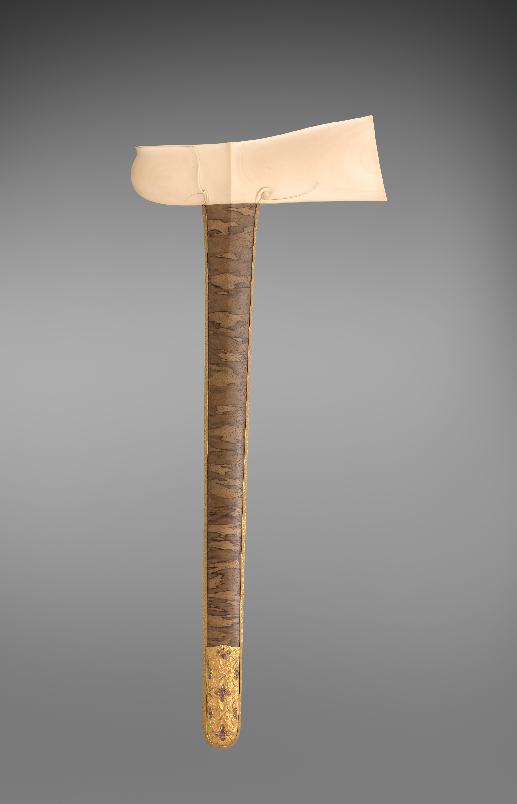 Scabbard by Artist. The image shows a hatchet with a wooden handle and a bone or ivory head. The head of the hatchet is made of a light-colored material, possibly bone or ivory, and has a curved blade with a flat edge. The handle is made of dark wood with a lighter-colored wood or metal ferrule at the bottom. The ferrule has a decorative floral pattern etched into it. The background of the image is a gradient of gray, with the top being darker and the bottom being lighter.