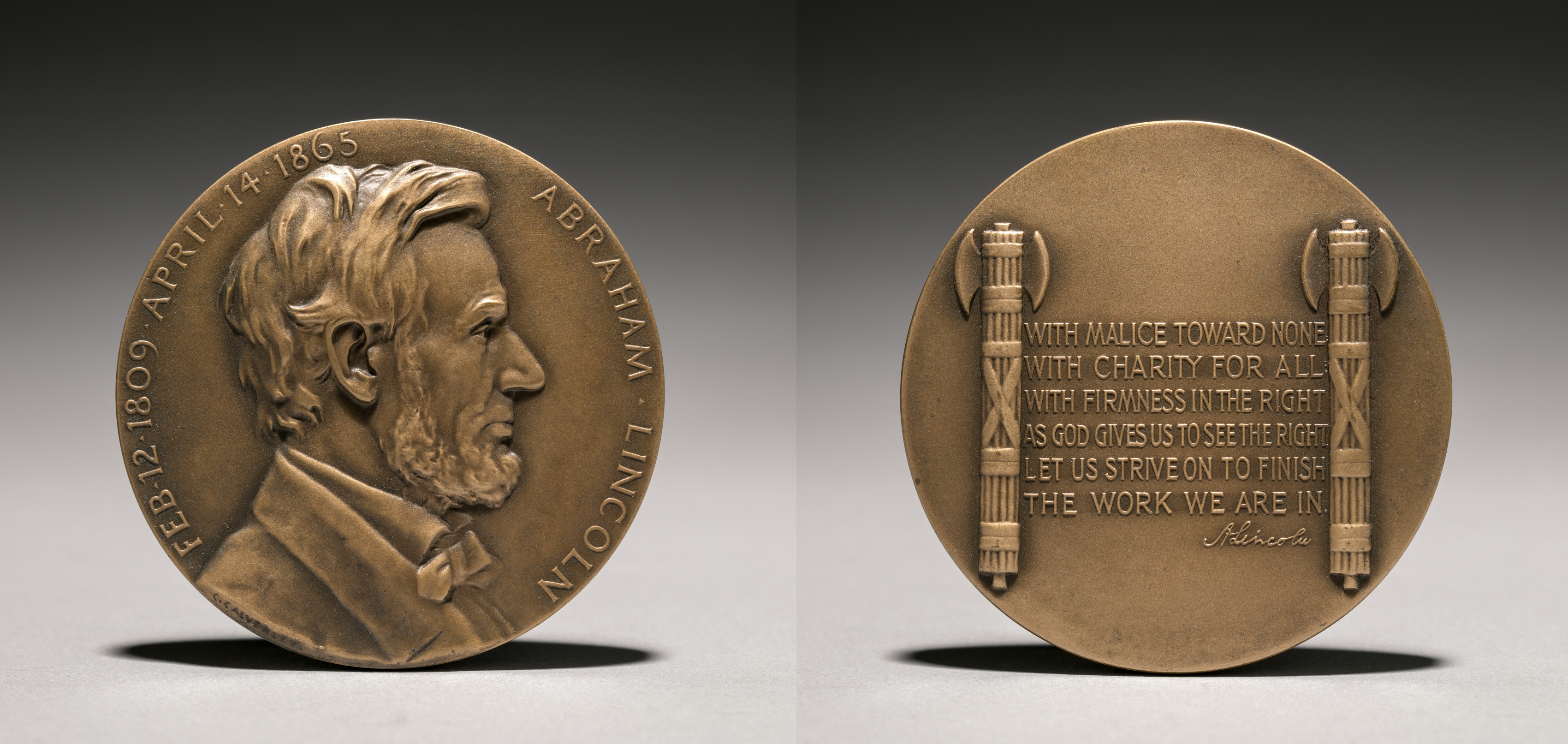 Bronze medal, two sides shown. Left side features a profile portrait of a man with short hair and a beard, wearing a collared shirt. Text around edge of left side: "FEB 12 1809 APRIL 14 1865 ABRAHAM LINCOLN". Right side features a quote in several lines of text, with two torches on either side. Quote reads: "WITH MALICE TOWARD NONE WITH CHARITY FOR ALL WITH FIRMNESS IN THE RIGHT AS GOD GIVES US TO SEE THE RIGHT LET US STRIVE ON TO FINISH THE WORK WE ARE IN". Signature at bottom of quote: "A Lincoln".