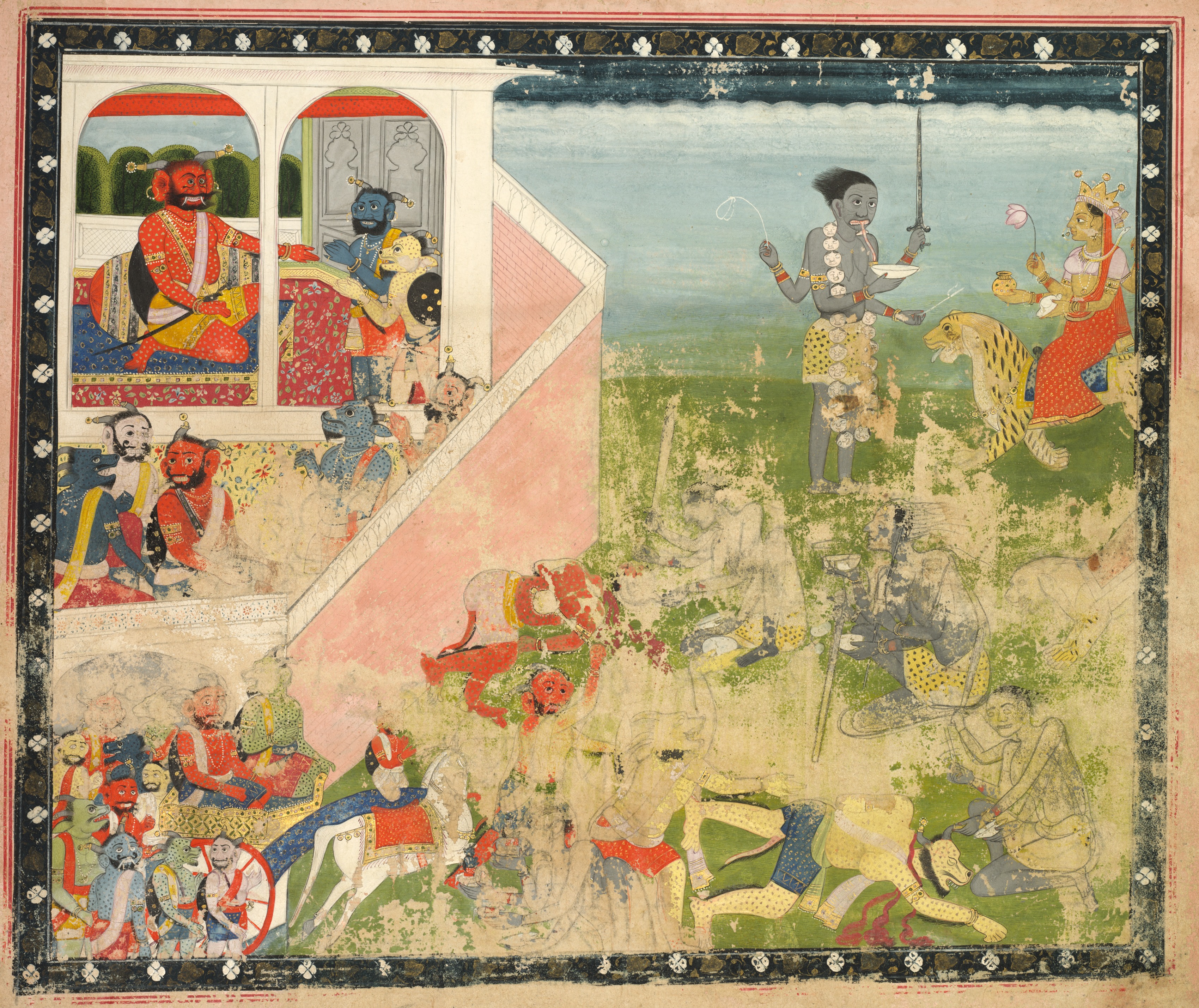 Colorful illustration depicting a battle scene from "Kali and Devi Attack: Leaf from a Devi Mahatmya". The artwork shows a chaotic scene with multiple figures engaged in combat. On the right, a woman with a crown rides a tiger; she holds a sword in one hand and a lotus flower in the other. A gray-skinned man nearby brandishes a whip. In the upper-left corner, two people observe from a balcony; one is red-skinned and sits on a blue and gold patterned cloth, while the other stands beside him, blue-skinned and holding a bow. The artwork contrasts vibrant and muted colors due to its aged condition, with a black and white patterned border encircling it. The painting presents a dynamic and intricate visual narrative.