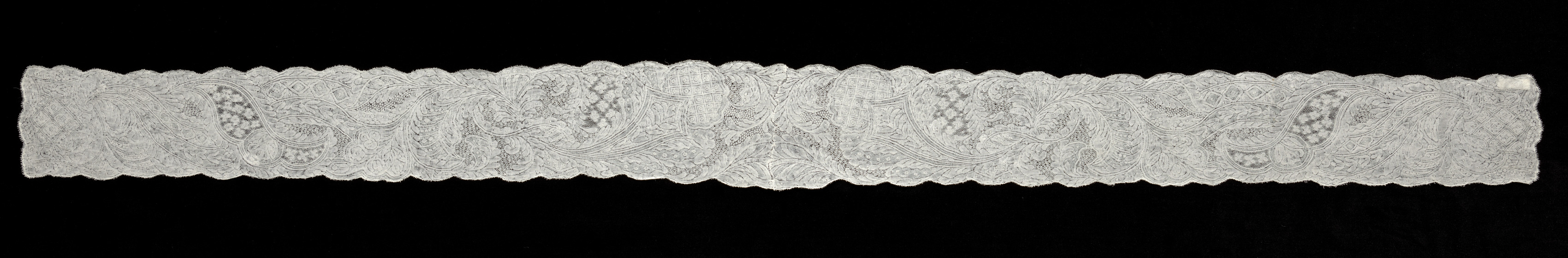 The Pair of Bobbin Lace (Valenciennes) Lappets by an unknown artist shows a long, thin, off-white piece of lace against a black background. The lace has a wavy edge on top and bottom. It features repeating patterns with floral motifs and geometric shapes. The lace appears to be made of a delicate, intricate design with a focus on detailed weaving.