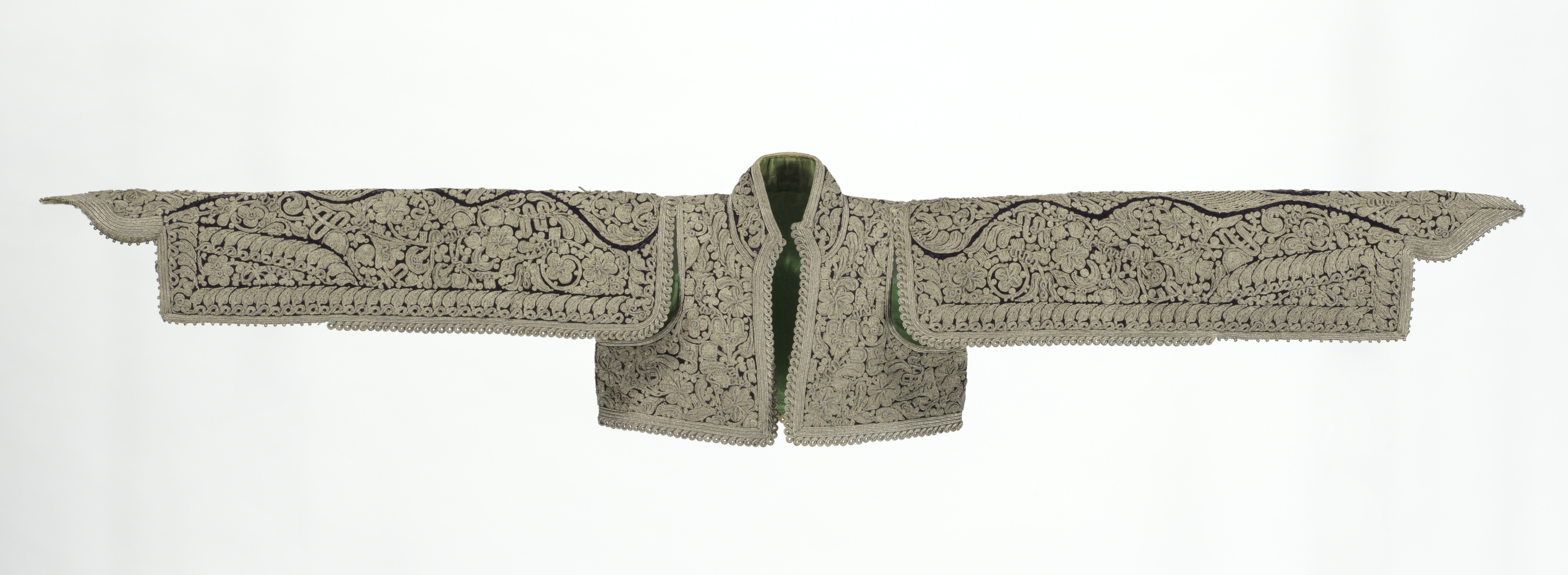 The image depicts a gray Jacket by artist Robert Mapplethorpe. The jacket is intricately embroidered with floral patterns and has a green interior lining visible at the opening. It features a stand-up collar and wide, straight sleeves with pointed ends. The garment is open, showcasing its interior, and appears to be made of a formal material such as silk or satin. The background of the image is white.