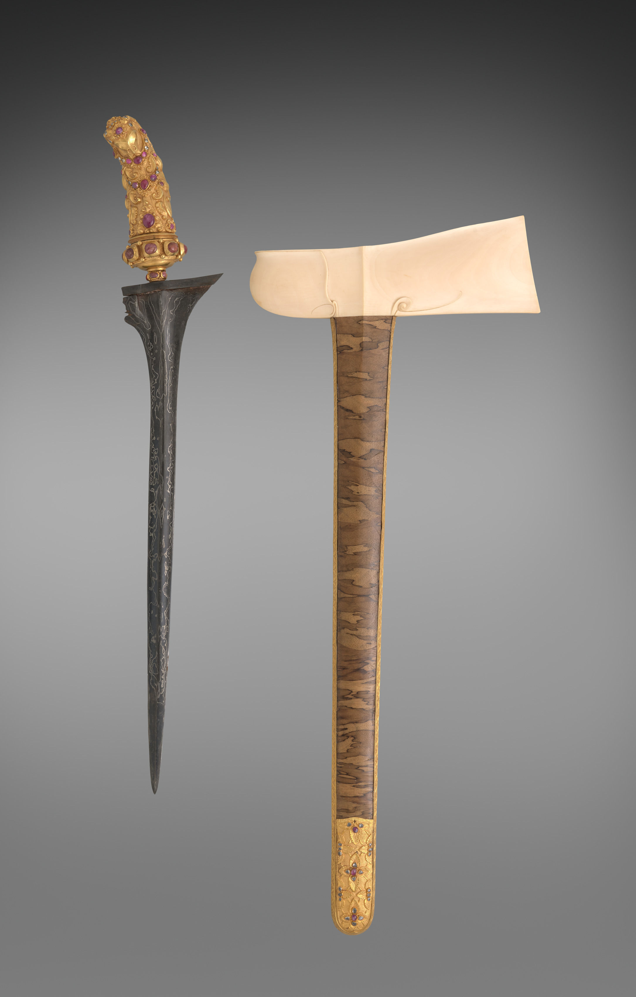 Kris and Scabbard. The image shows a dagger and a hatchet. The dagger has a long, thin blade that tapers to a point. The blade is dark-colored and appears to have an intricate design. The handle of the dagger is gold-colored with pink gemstones. The handle is shaped like a hook. To the right of the dagger is a hatchet with a curved blade. The hatchet's blade is white. The handle of the hatchet is brown with a gold-colored base and a gold-colored decorative piece.