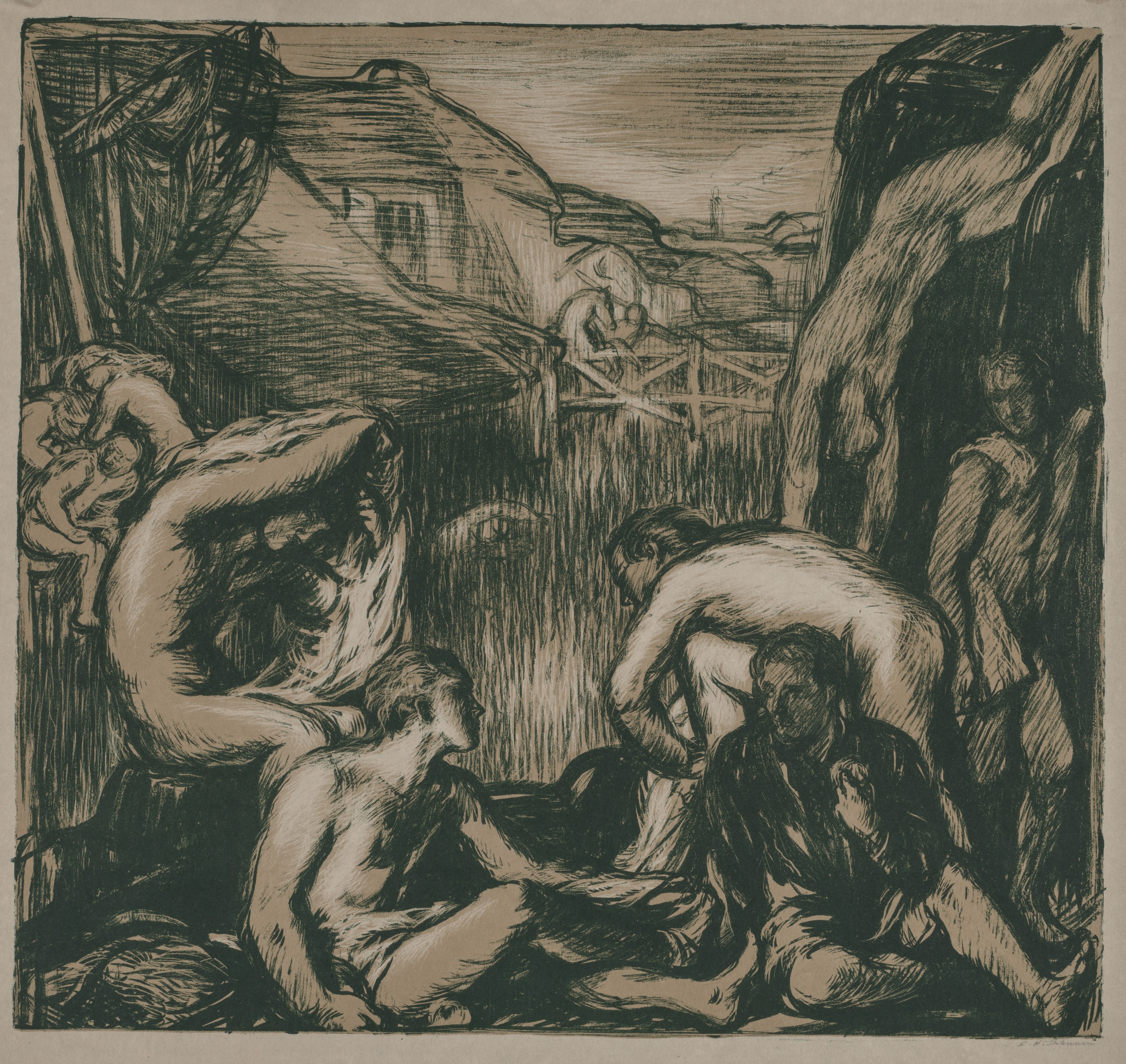 The Mill-Pond by Charles Hasslewood Shannon. Black and light brown colored drawing. A landscape scene of a body of water with a structure and bridge on the far side. Three nude figures in the foreground, and one nude figure on the left on a lower level. Two of the figures are on the right and one is on the left, with their backs turned. A fifth nude figure on the left near the top climbing a structure.