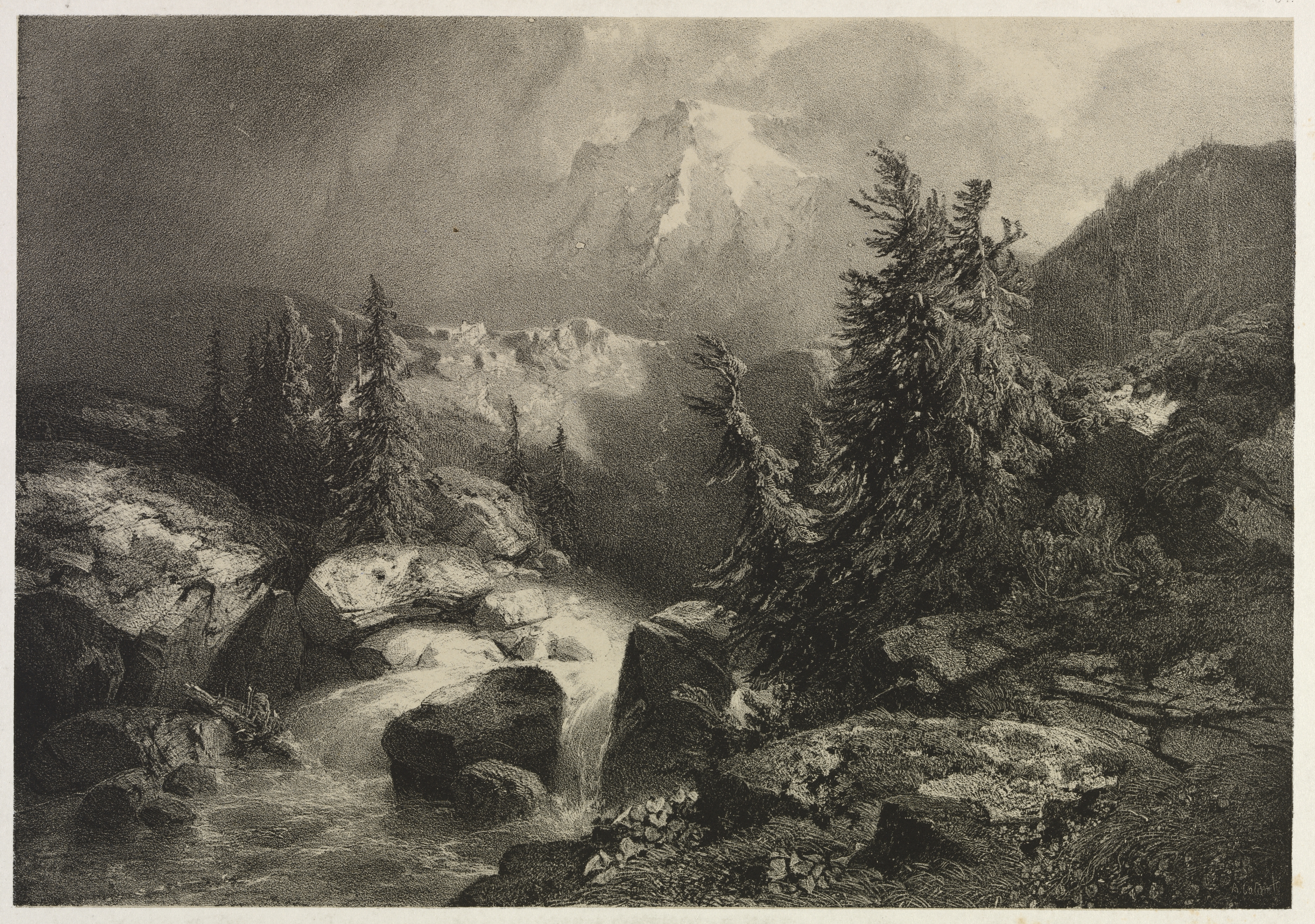 Black and white mountainous landscape with a stream, large boulders and pine trees in the foreground. A large evergreen tree stands on the right side. Water flows from behind a large boulder on the left. Mountains and a cloudy sky are in the background. The image depicts a stormy scene titled "Storm in the Alps" by Alexandre Calame.