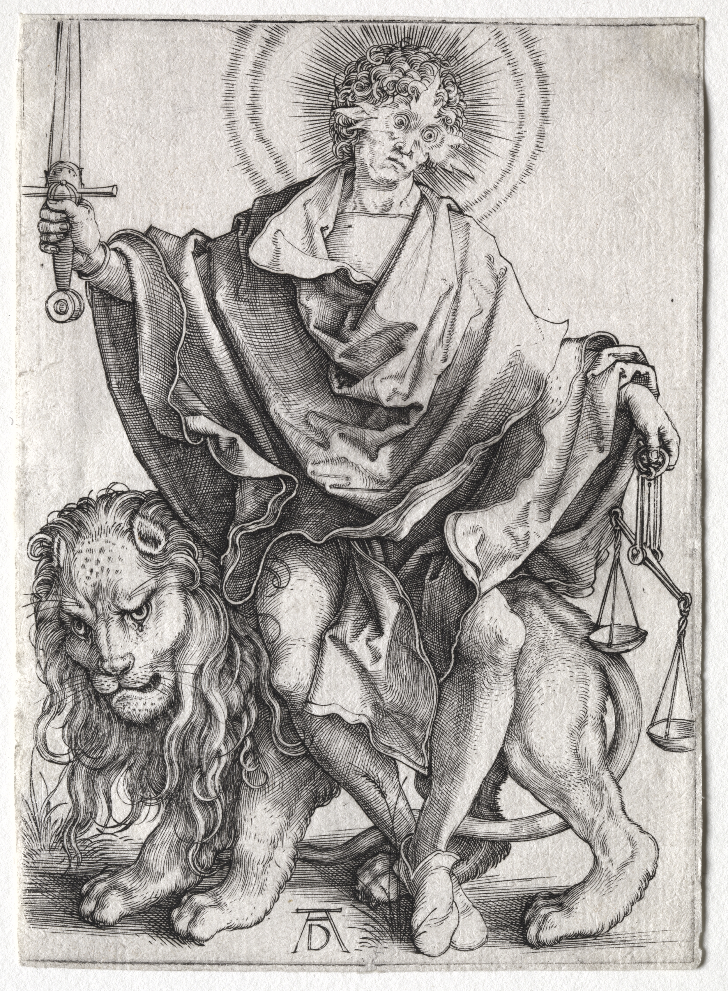 Black and white engraving of a man with curly hair and a halo sitting on top of a lion. The man has one leg crossed over the other. He holds a sword in one hand and scales in the other. The lion faces left with its body facing right. The man wears a robe with folds. The background is plain with lines emanating from the halo. The artist's monogram "AD" appears at the bottom.