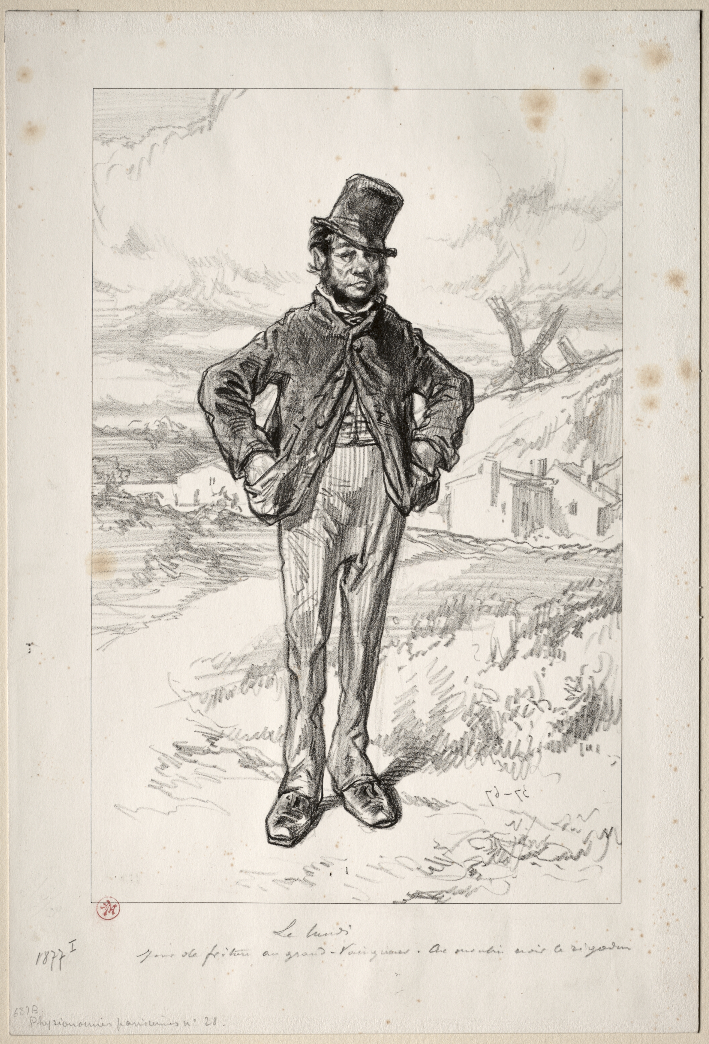 Black and white drawing of a man standing with hands on hips. The man has a beard and short hair. He wears a top hat, a jacket, striped pants, and shoes. The man stands on a path with grass and a field behind him. There are buildings on the right side. The sky has clouds. The image has a border around it and a white background. The drawing style is sketchy. The image appears to be on aged paper with brown spots.
