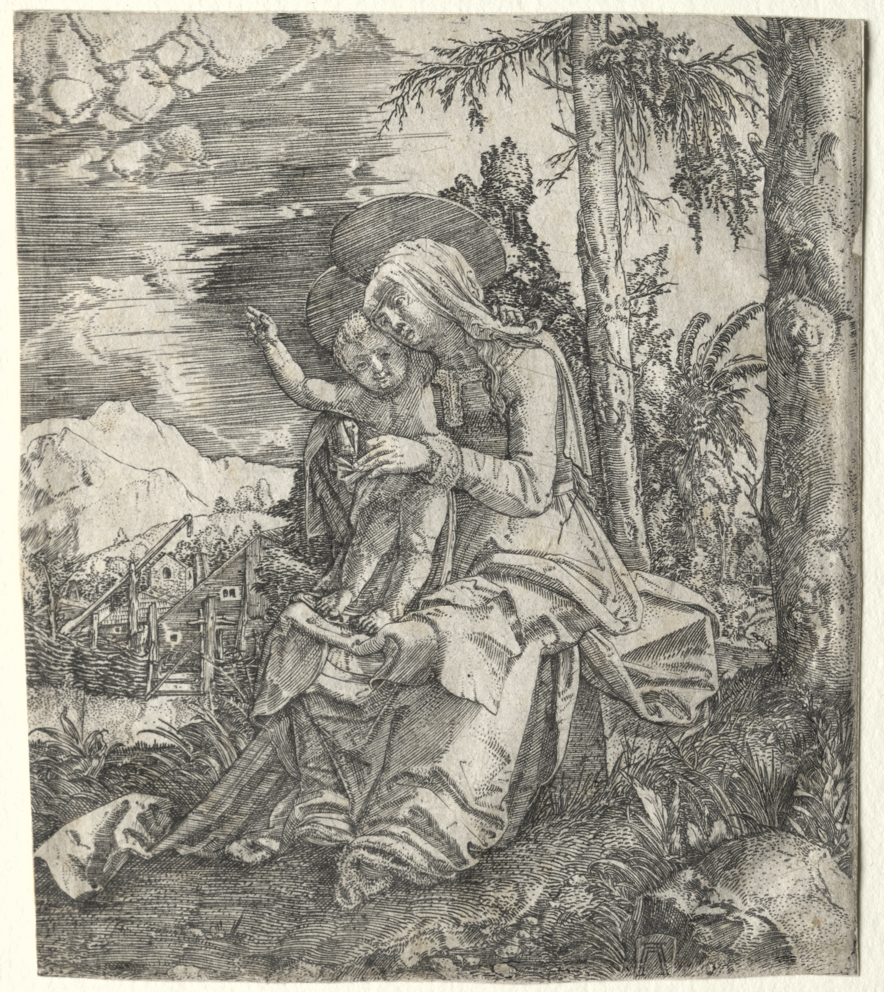 The Virgin Mary sitting on the ground, wearing a long dress and a head covering. The Virgin is holding the Christ child on her lap. The child is pointing upward with their right hand. Mary is looking down at the child. The background shows a landscape with trees, buildings, and mountains. The scene is rendered in black and white.