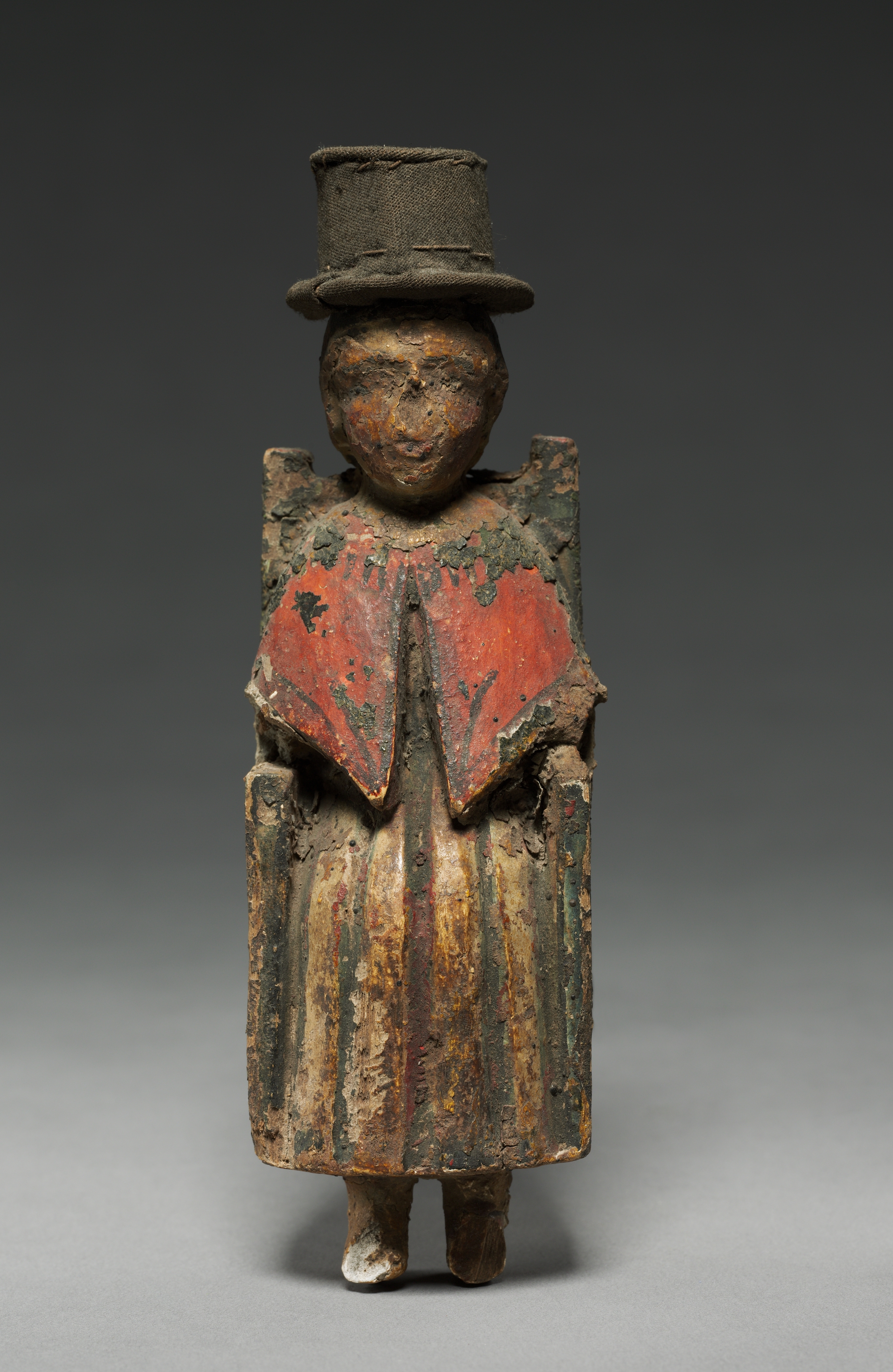 The "Christ Child: santo de bulto" depicts a small, worn statue of the Christ child. The figure has a round face with minimal features. It wears a cylindrical hat made of fabric, a red vest or cape with a scalloped edge, and a long, striped dress. The statue appears to be made of wood and shows signs of aging and wear, with chipped paint and a rough texture. The background of the image is dark gray, which highlights the details of the statue. The figure stands with its feet shoulder-width apart.