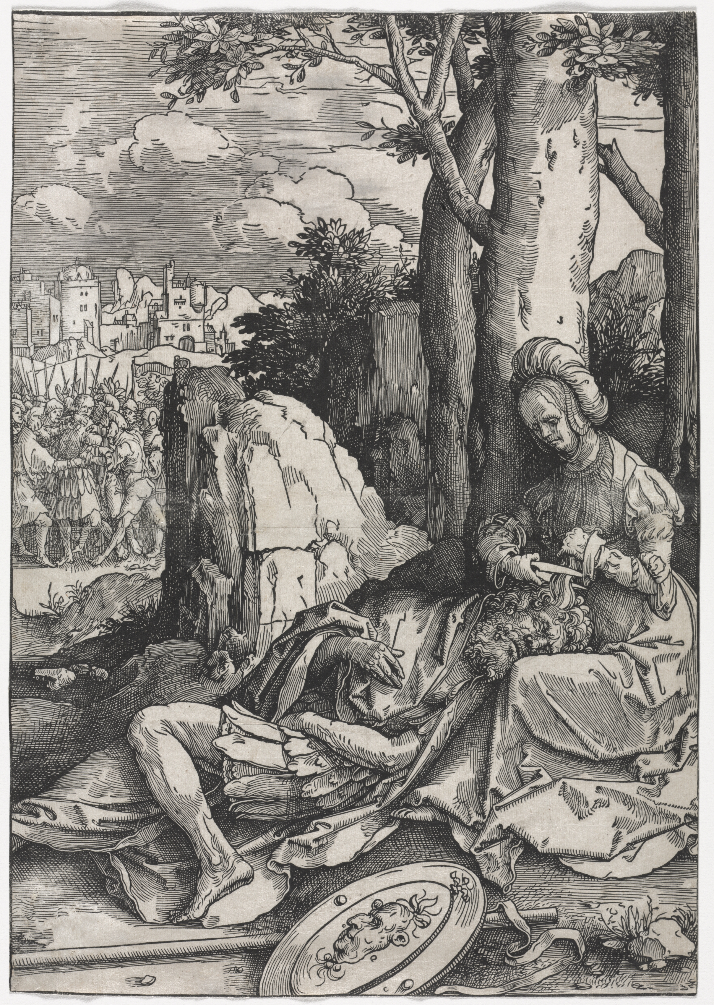The Power of Women: Samson and Delilah by Lucas van Leyden. The image depicts a black-and-white scene with a cloudy sky, trees in the right half, and a city on a hill in the background on the left. The scene features a man lying on the ground on the left, with a sword beside him and a shield in front. A woman sits on the right, cutting the man's hair with scissors. The man is muscular and naked from the waist up. The woman wears a long dress and a head covering. In the far background on the left, a group of people are shown.