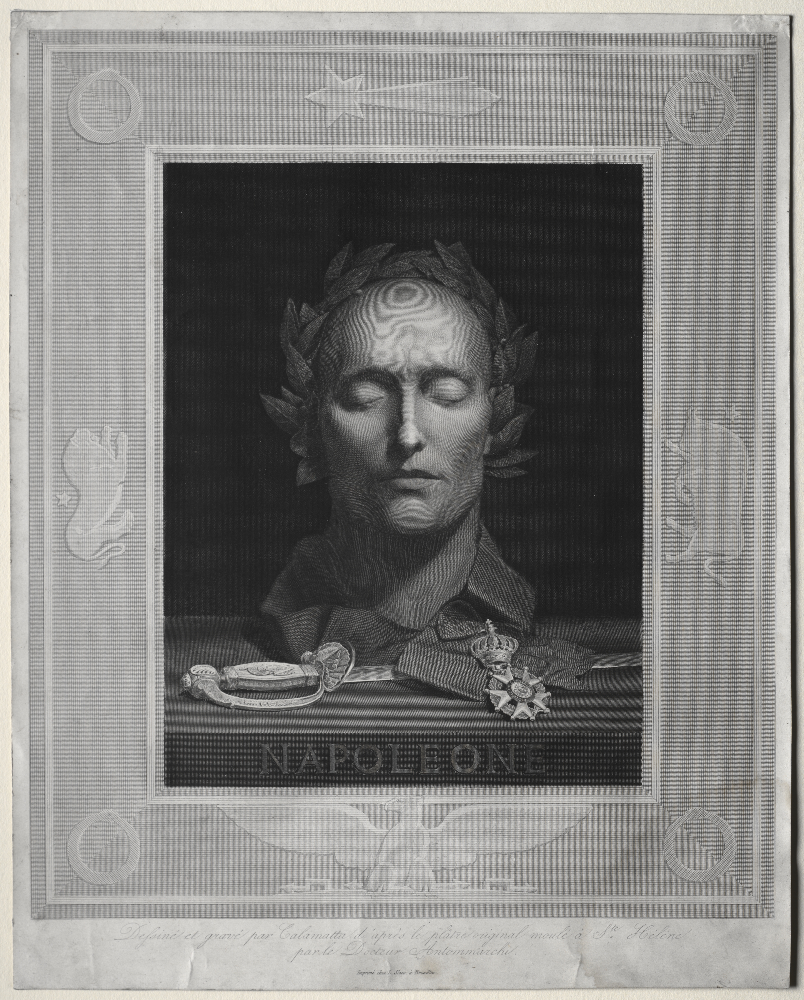 Black and white image of a man's head and shoulders. The man has a receding hairline. His hair is short. Laurel leaves are around his head. He has a military collar. Two medals are below his neck. The name "NAPOLEONE" is below the medals. The image of the man is in a rectangle. The rectangle is inside a larger rectangle with a star, circles, a hand, a bird and other shapes. The image has a light-gray background. The image appears to be on aged paper. The image is titled "Mask of Napoleon by Luigi Calamatta".