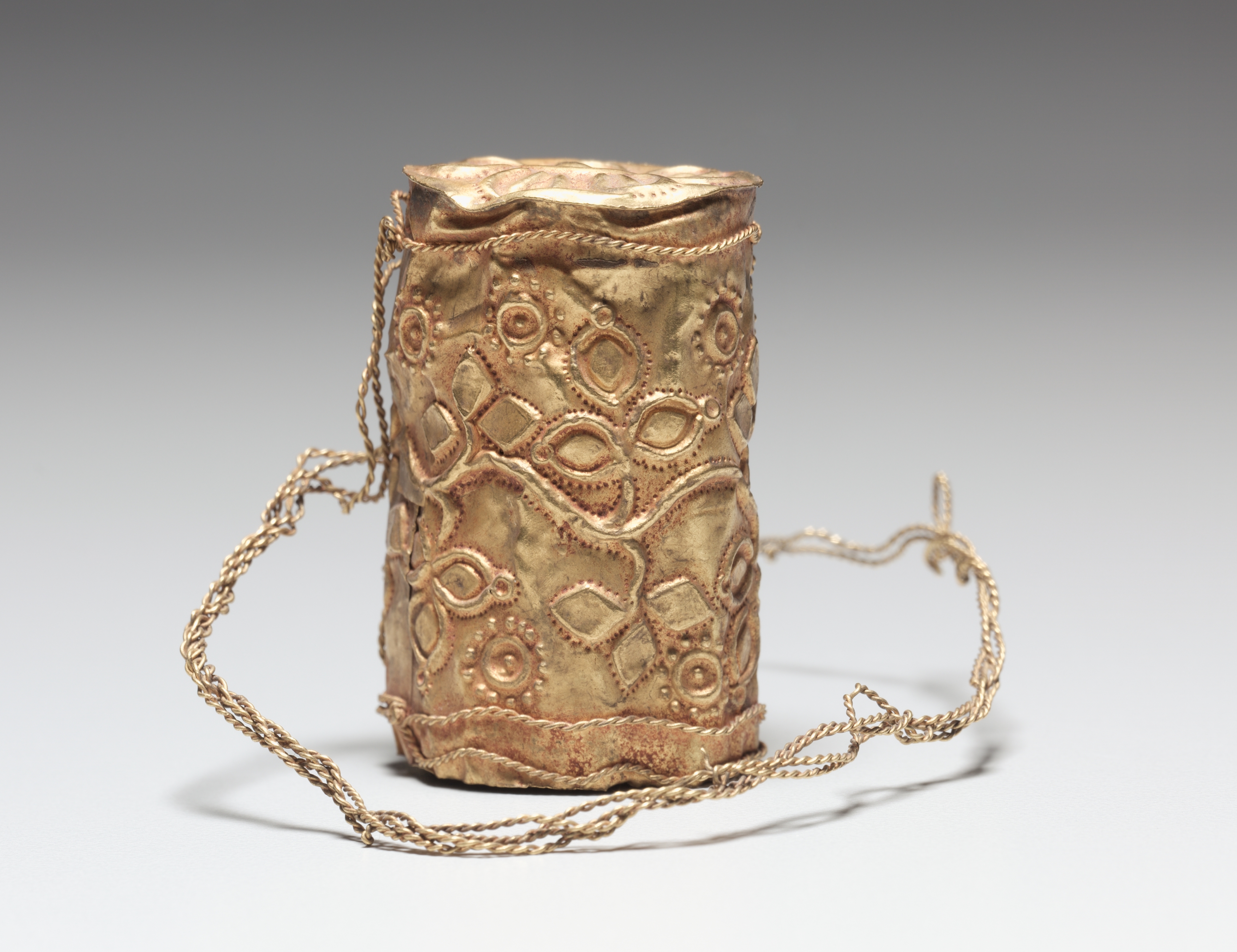Gold-colored metal object with a cylindrical shape. The object has a flat top with a wavy edge. It features a chain wrapped around its middle and two loose chains hanging from either side. The surface is adorned with raised patterns, including circles, ovals, and other shapes. The background transitions from dark gray at the top to light gray at the bottom. The object appears to be a Knife Handle Cover by an unknown artist.