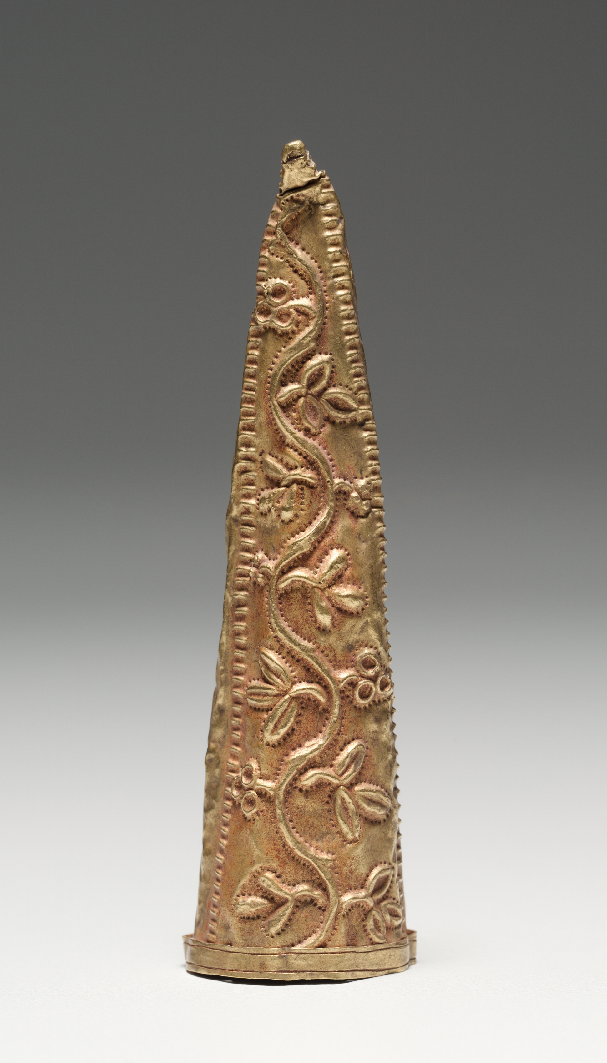 The object, titled "Knife-sheath tip (sika boha)", is a long, pointed, cone-shaped metal piece with a wide base that tapers to a narrower top. The metal appears to be bronze or brass in color. The surface features an etched design consisting of raised lines along the edges and a central floral vine pattern. The design wraps around the entire object. The background of the image is gray at the top and fades to white at the bottom.