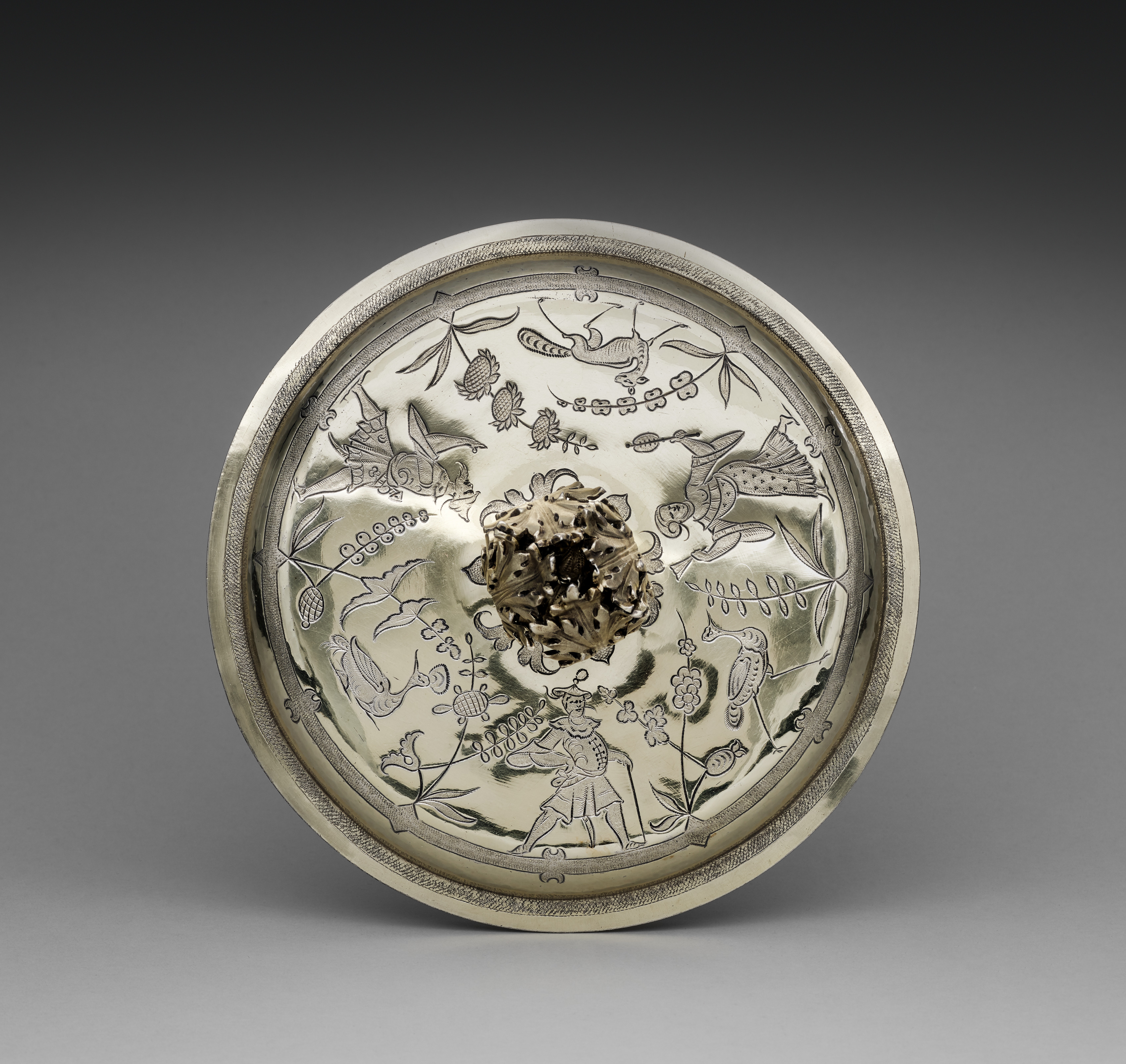Silver two-handled cup cover with a rounded shape and raised edge. The cover is decorated with engravings of various scenes. In the center, a raised circular area features a floral design. The main body of the cover showcases a man standing among plants, birds, and flowers. The background of the image is a gradient transitioning from dark gray at the top to light gray at the bottom.