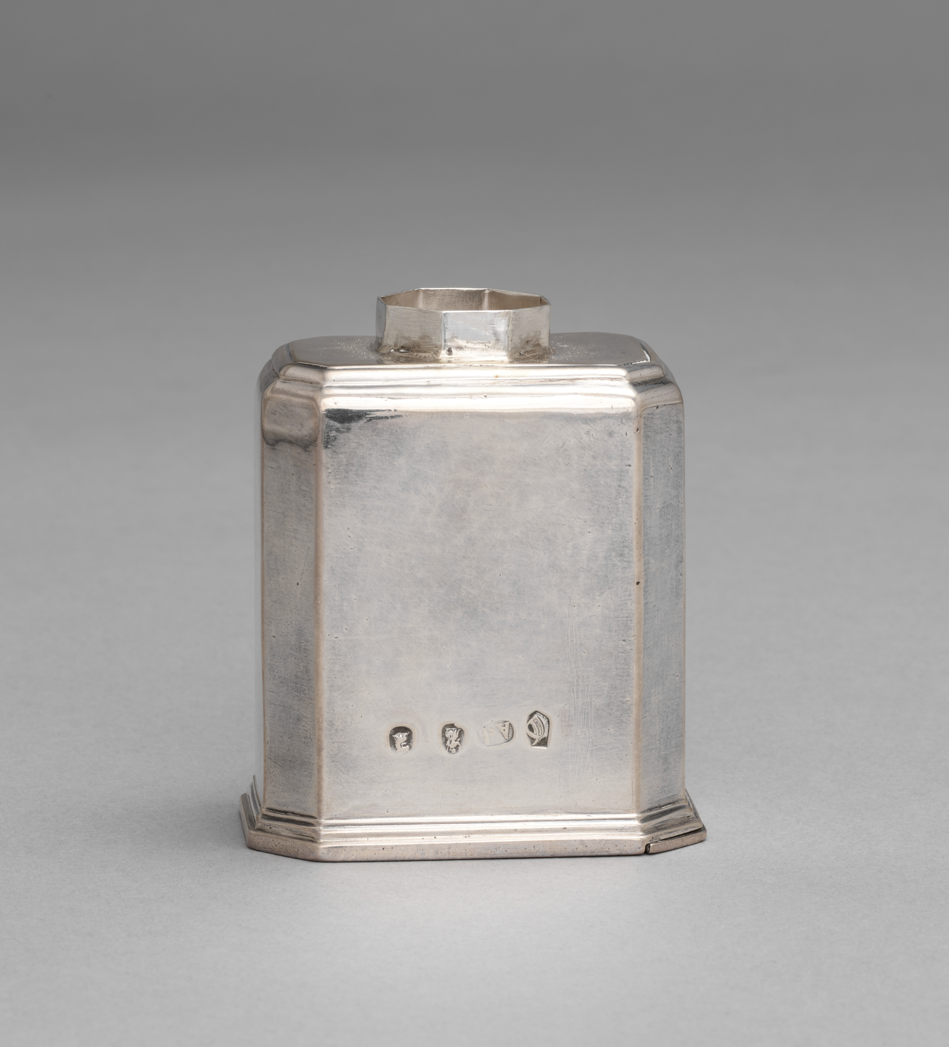 Tea Caddy by Thomas Ash. Silver tea caddy with a square base and rounded edges. The caddy has a small handle on top and four hallmark stamps on the bottom. The caddy is made of silver with a slightly tarnished appearance. It has a flat lid with a small square handle on top. The base is octagonal with a decorative border around the edges. The background is a plain gray color.