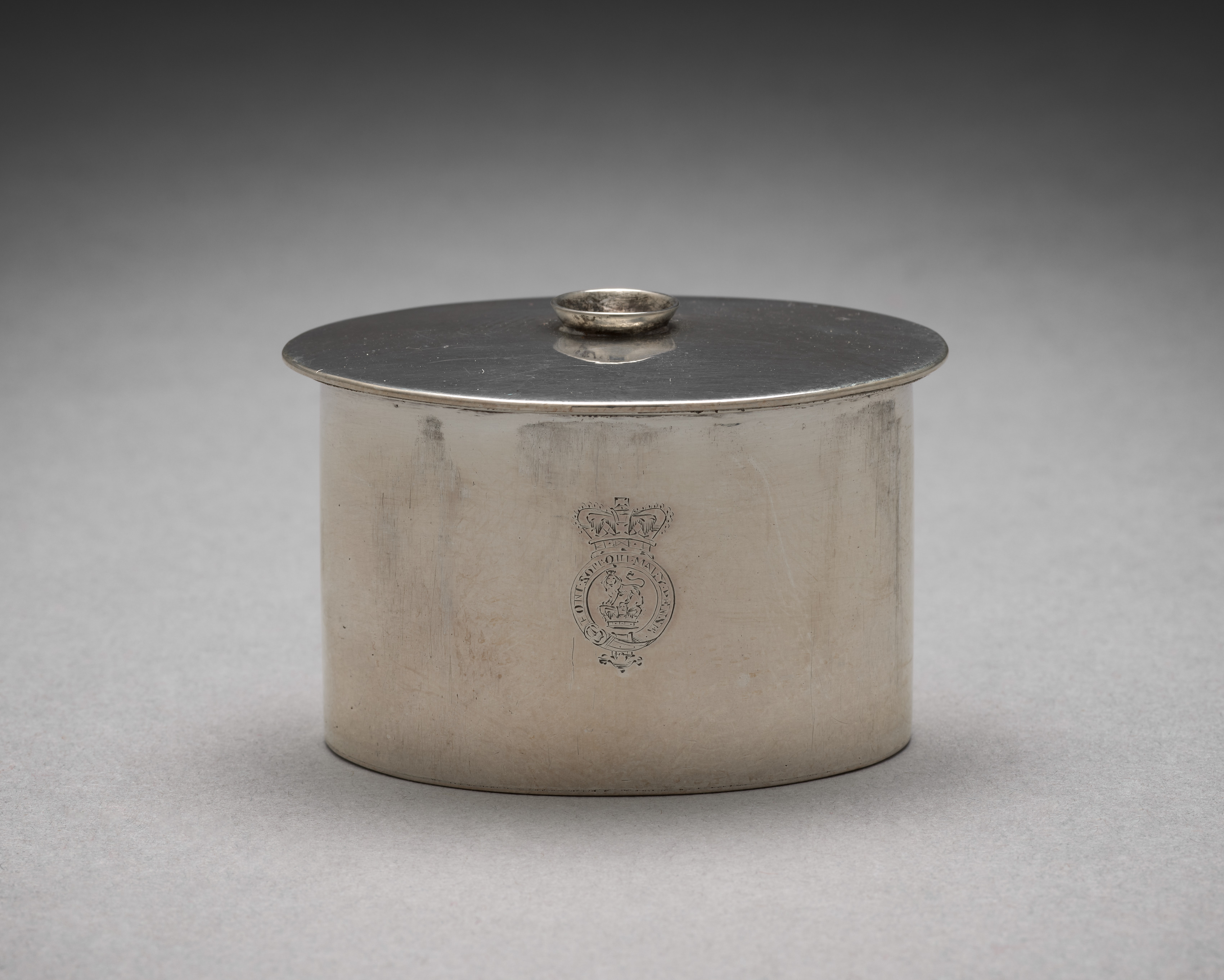 Metallic cylindrical container with a lid. The container is made of silver-colored metal, likely silver. The cylindrical body is wider than it is tall. The lid is flat with a small circular handle at the top. There is an engraved emblem on the front of the container featuring a crown and a circular shape with an indistinguishable image inside. The background fades from dark gray at the top to light gray at the bottom. The image is likely a product or catalog photo. The title of the image is "Cover for a Hot Water Jug" by John.