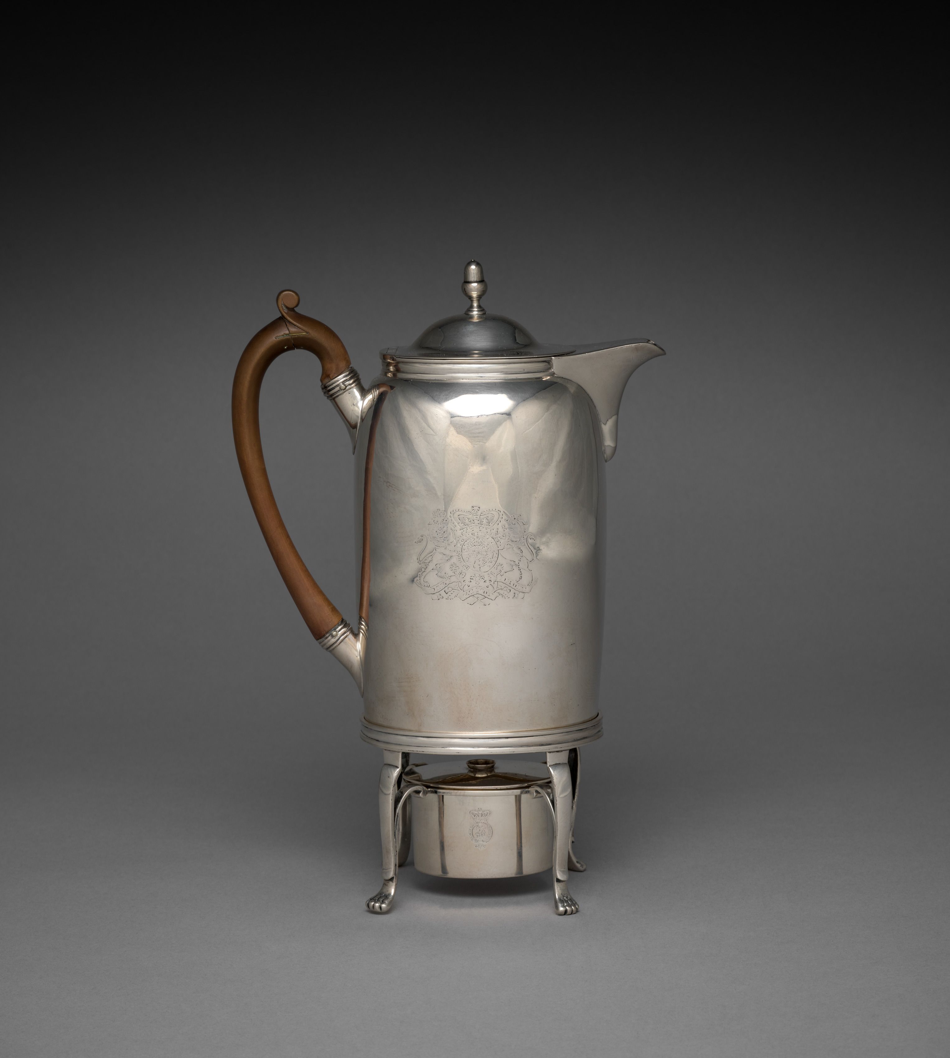 Silver hot water jug with a hinged cover, featuring an engraving on the front; handle is made of brown material, possibly wood or plastic; three metal feet; spout on one side; small finial on top of lid; cylindrical body with slightly tapered top and bottom; engraving on front of body; small burner or fuel container underneath.