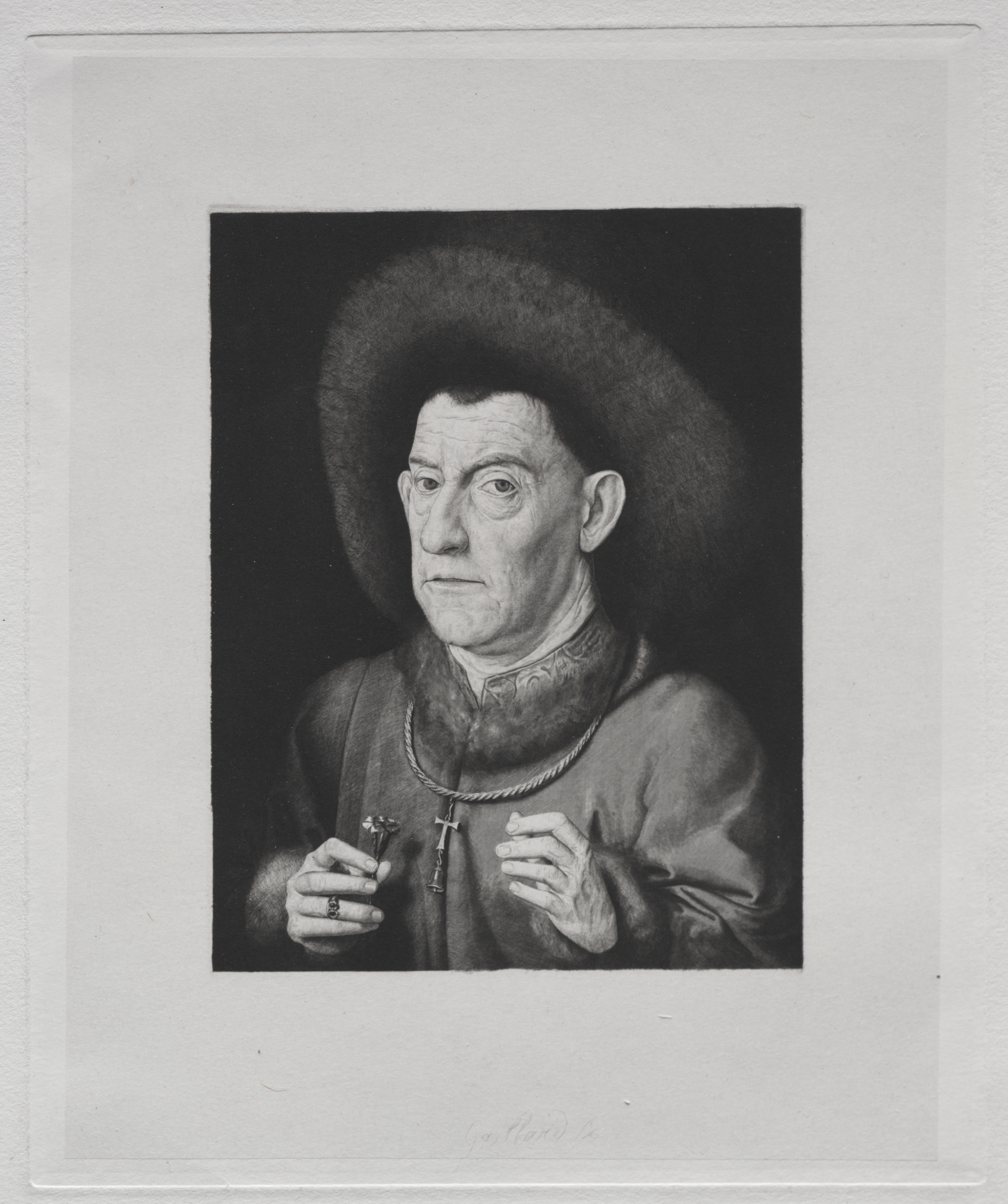 Man with a Pink by Claude-Ferdinand Gaillard: A black and white image of a man wearing a wide-brimmed hat and a high-necked shirt. He is holding flowers in his right hand and appears to be adjusting his clothing with his left. A rope with a cross hangs around his neck. The man is set against a dark background. A white border surrounds the image.