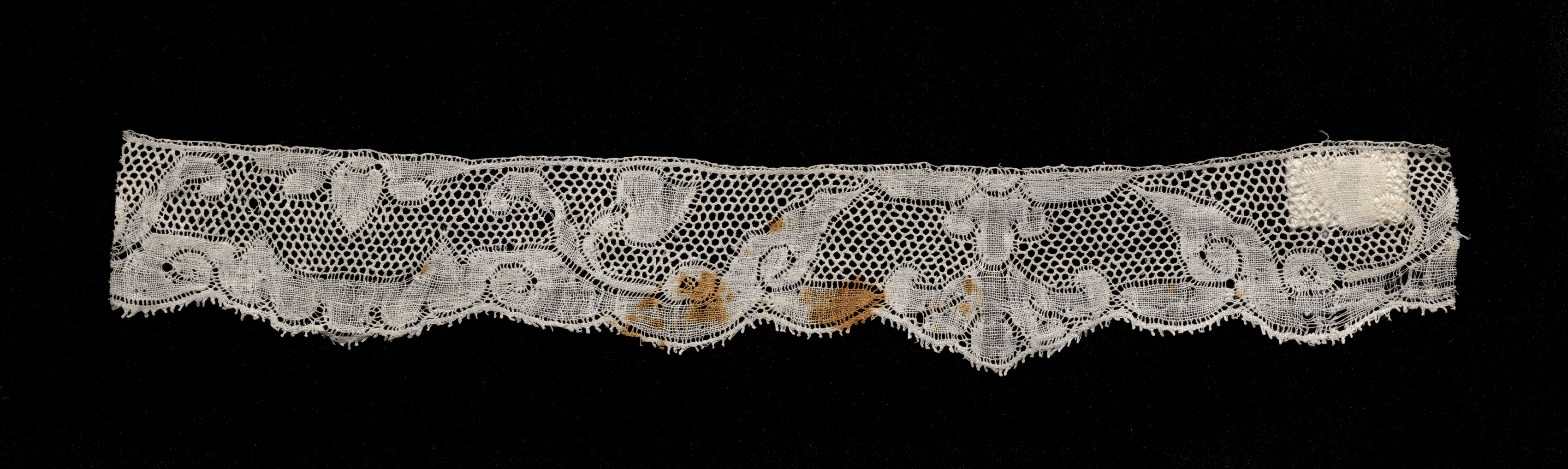 White bobbin lace edging with floral pattern on black background. The lace is long and narrow, with a scalloped edge. It features a repeating design of floral motifs and scrollwork. The lace is made up of intricate holes and netting. A small section of the lace has a brown discoloration. The lace appears to be hand-made. The artist of this piece is unknown. The title of this piece is "Bobbin Lace Edging".