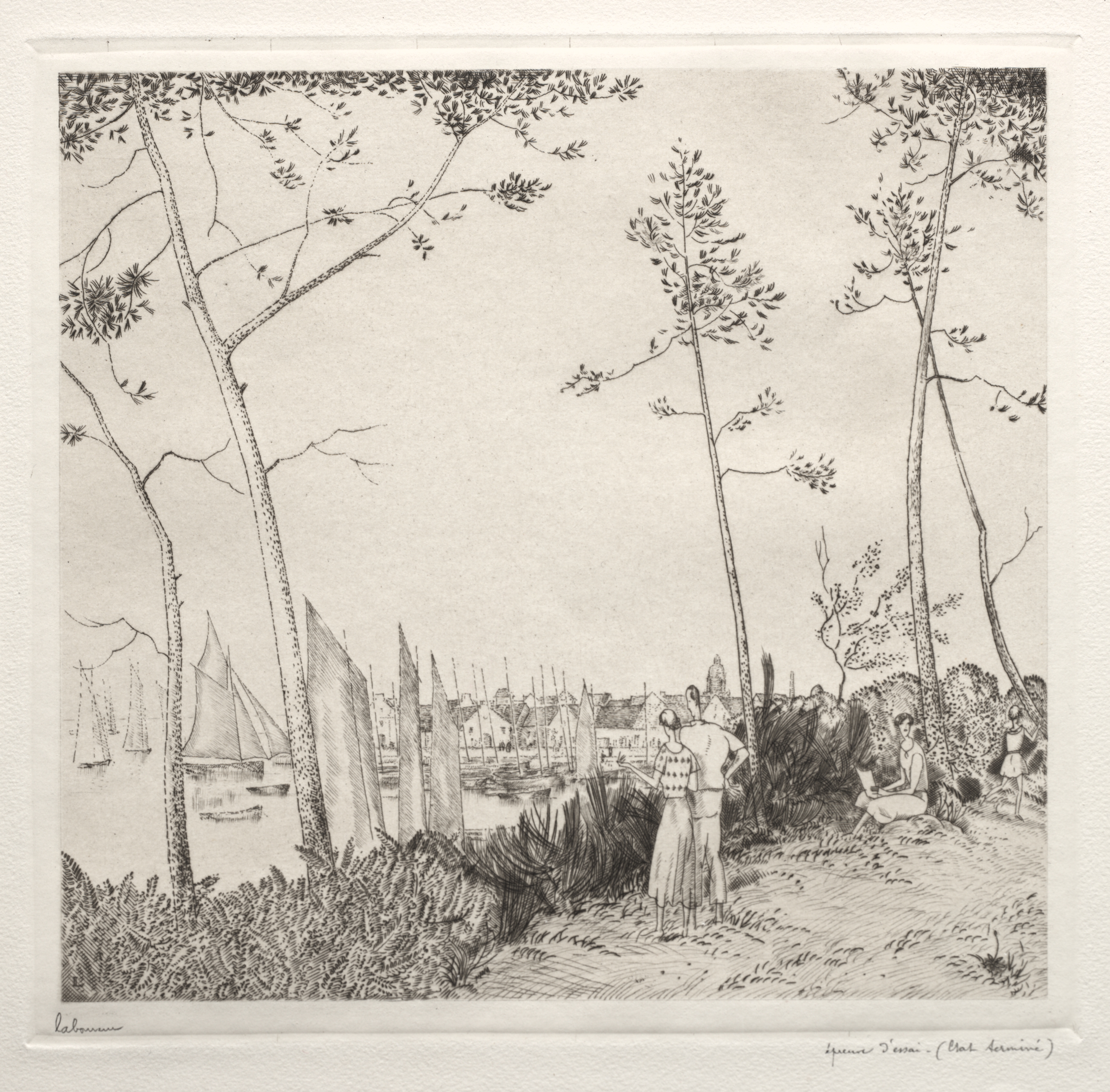 Black and white drawing of a waterfront scene with people standing on the shore. A woman wears a long dress and a man beside her wears a white shirt and pants. A person sits on the right. Several sailboats are on the water in the background, and buildings are across the water. There are trees on the shore, with foliage and bushes on both sides of a pathway. The sky appears clear. The drawing style is detailed. The artwork is signed "Laboureur" in the bottom left corner.