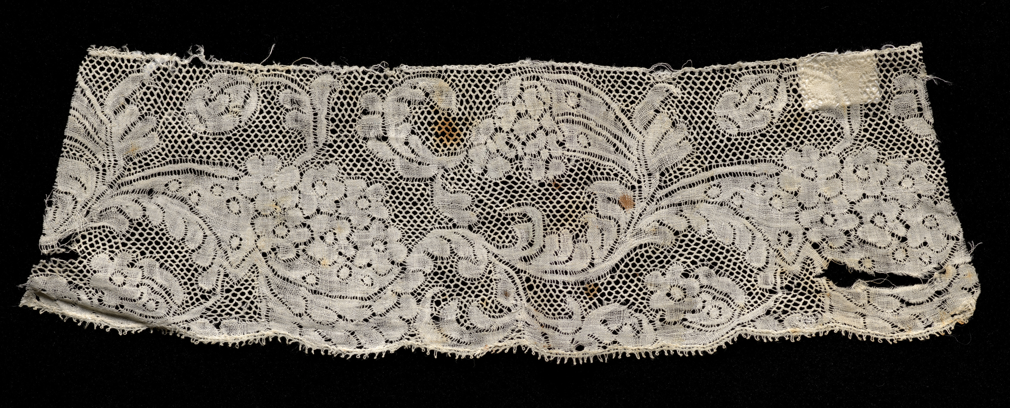 White bobbin lace edging with floral and leaf patterns on a black background. The lace is long and rectangular with a wavy bottom edge. It features intricate floral and leaf designs throughout. The top edge is mostly straight but slightly frayed and uneven in places. The lace appears old and worn with some areas damaged or missing.