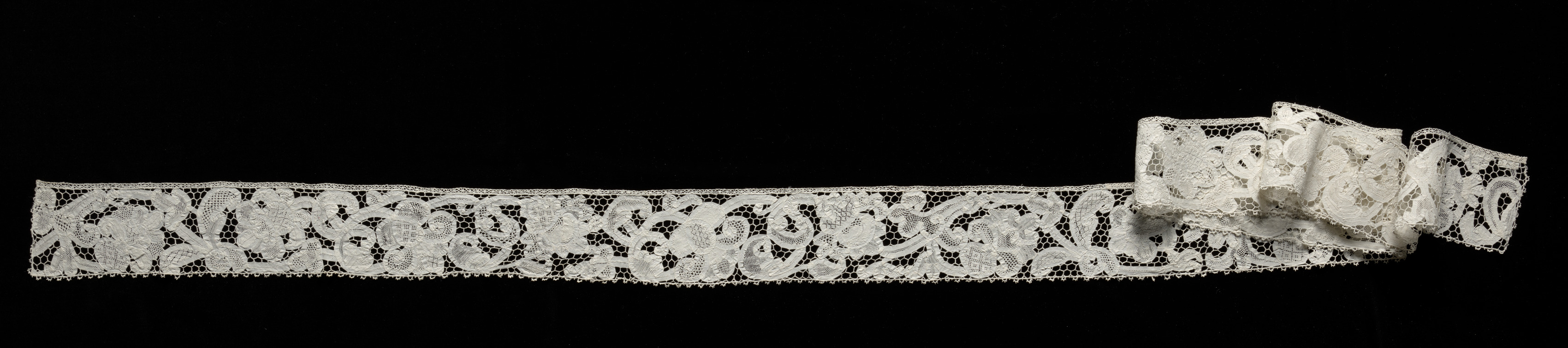 White lace trim with floral patterns and leaf-like shapes. The trim runs horizontally across the image. A portion of the trim is folded on top of itself on the right side. The background is black.