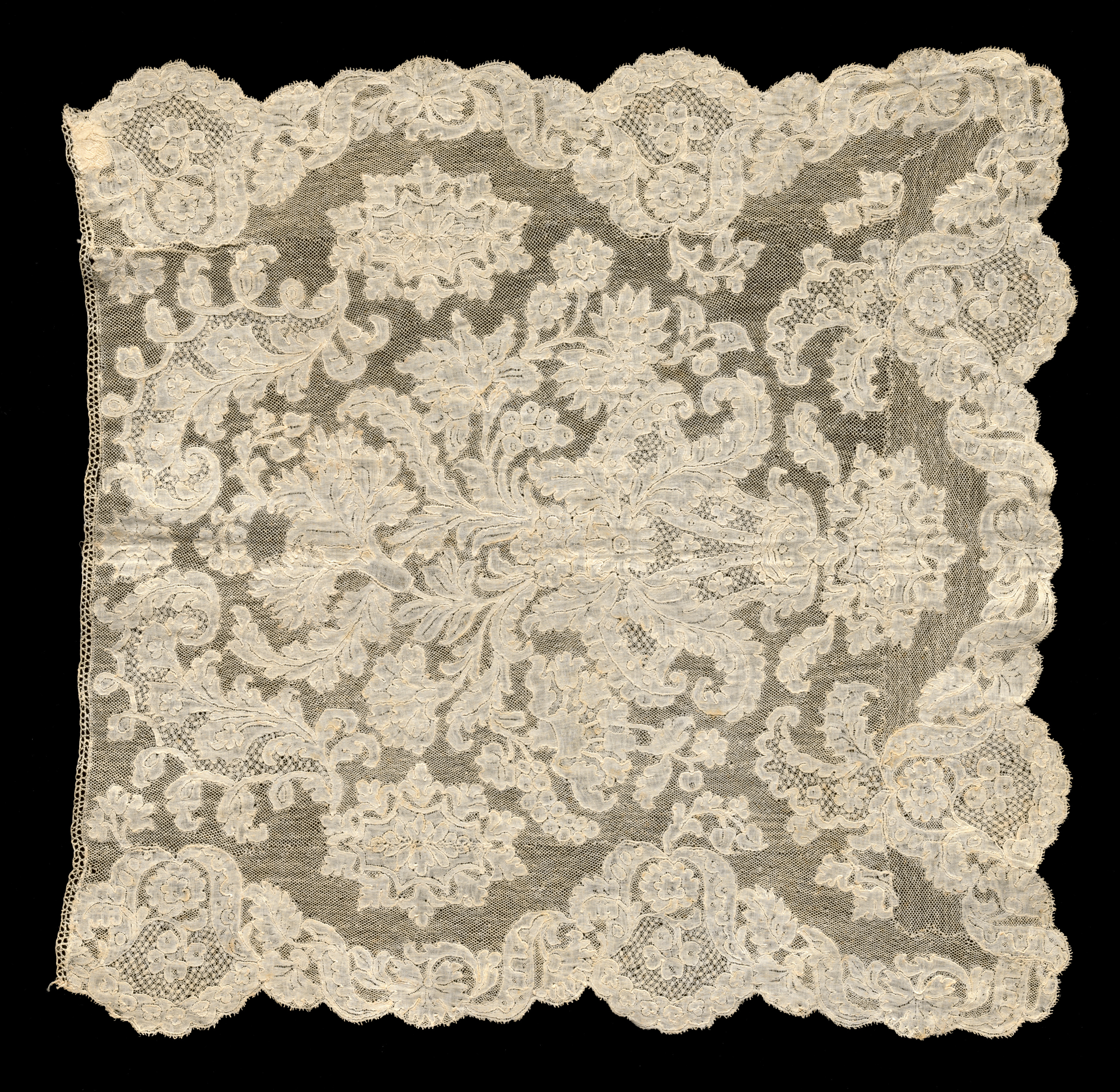 The Bobbin Lace Jabot by an unknown artist is a square piece of off-white lace with a floral design on a black background. The lace has a scalloped edge all around. The floral design consists of intricate patterns of leaves and flowers. The lace appears to be made of a delicate, open-weave fabric with a mesh-like background. The overall design is symmetrical, with a central floral motif surrounded by repeating patterns of leaves and flowers. The lace is off-white or cream-colored, with no other colors visible. The background of the image is solid black, providing high contrast to the lace. The lace piece appears to be a type of jabot, which is a decorative piece of fabric worn around the neck. The lace is likely made using the bobbin lace technique, which involves weaving threads using multiple bobbins. The image shows the lace piece in a flat, two-dimensional state, with no folds or draping visible.