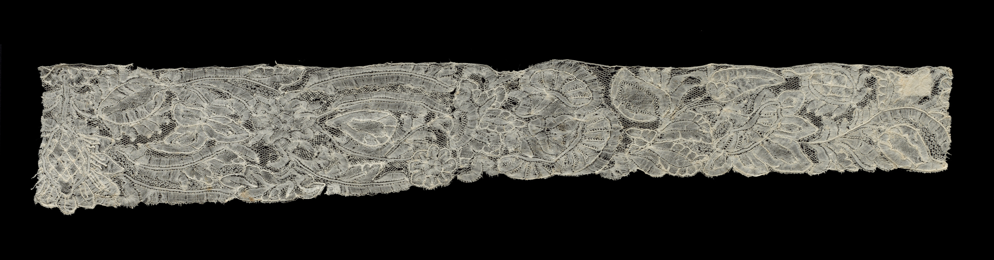 The image shows a long, thin piece of white bobbin lace against a black background. The lace is intricately designed with floral patterns and curved lines. The lace appears to be hand-made and has a delicate, frayed edge. The lace is mostly a uniform white color with minimal shading or texture visible. It is positioned horizontally across the center of the image. The background is solid black, providing high contrast with the lace. The style suggests it is a piece of traditional lace, specifically an edging for a cap, by the artist unknown.