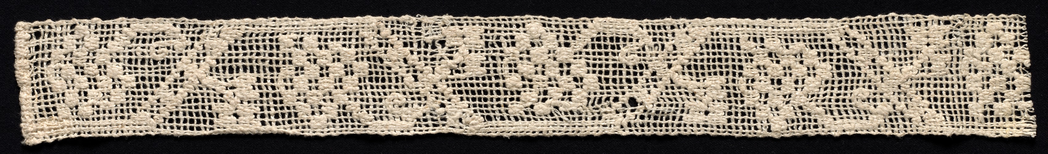 The image shows a long, thin, off-white piece of lace against a black background. The lace is rectangular and horizontally oriented. The lace features a repeating pattern of geometric shapes and floral motifs. The geometric pattern consists of small squares and circles. Floral patterns are woven throughout the geometric pattern. The floral motifs are small and intricate. The lace appears to be made of a lightweight material, possibly cotton or silk. The edges of the lace are rough and uneven. The black background provides high contrast to the off-white lace, making the details of the lace visible. The artwork is by an unknown artist and is titled "Fragment of a Band with Geometric Pattern and Floral Motif".
