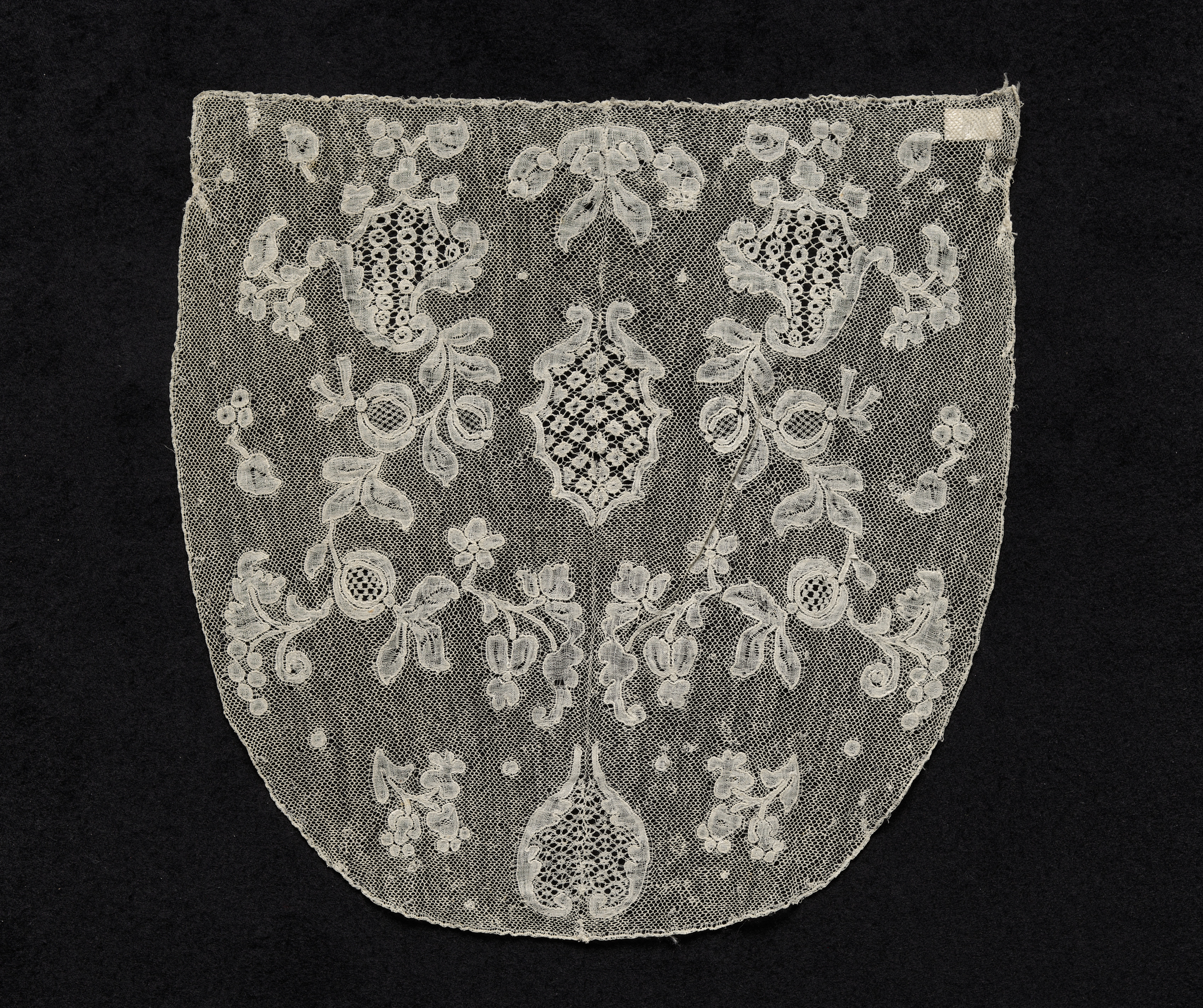 White bobbin lace edging against a black background. The lace is semi-circular with a flat top. The lace features a floral design with leaves and flowers. There are three distinct sections: a teardrop-shaped center at the bottom, a diamond-shaped center at the top and a symmetrical arrangement of flowers and leaves on either side. The lace is made of a mesh-like material with a repeating pattern of floral motifs. The top edge of the lace is rough and uneven. A small white tag is attached to the top-right corner.