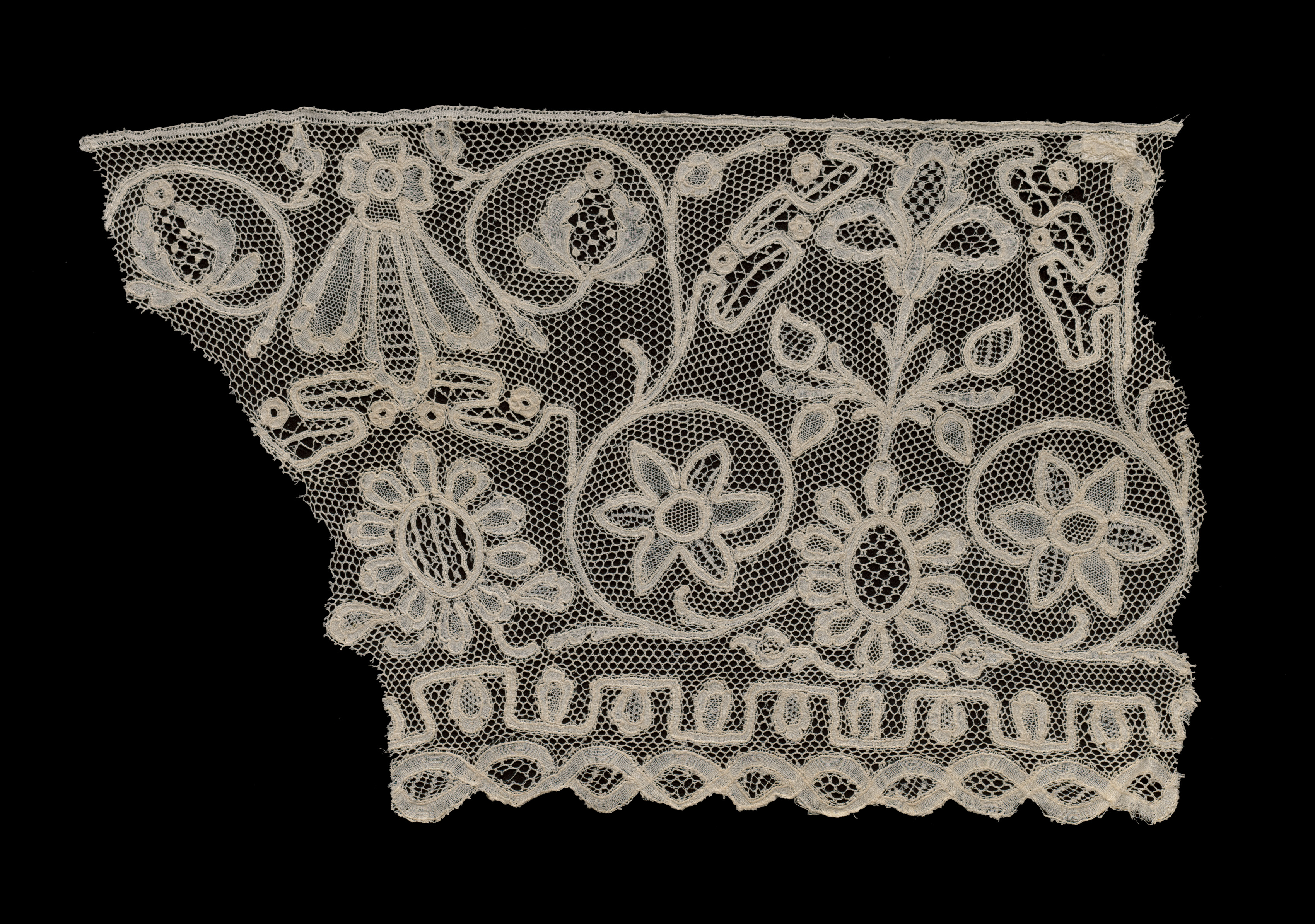 The piece of lace is a light beige color. It has a net-like background made of tiny hexagonal holes. The lace features a floral pattern with leaves and stems. There are large flowers and smaller flowers and buds. The lace has a scalloped edge at the bottom. The top edge is straight with some fraying. The lace is shaped like a trapezoid, with the left side shorter than the right side. The background behind the lace is solid black.