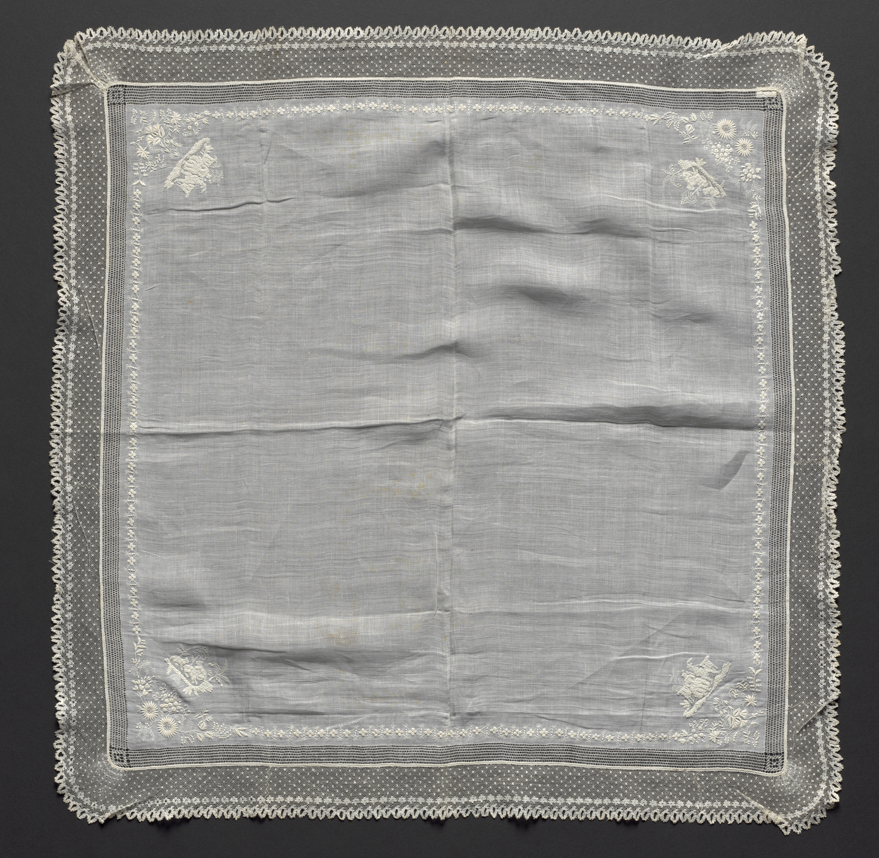 Square handkerchief with intricate white embroidery on a light gray background. The handkerchief has a sheer border with a repeating pattern of small white dots and a white scalloped edge. Inside the border, a thin white line runs along the edges. In each corner, there are white floral embroidery designs. The center of the handkerchief is plain with a few wrinkles. The handkerchief is titled "Handekrchief" by an unknown artist.