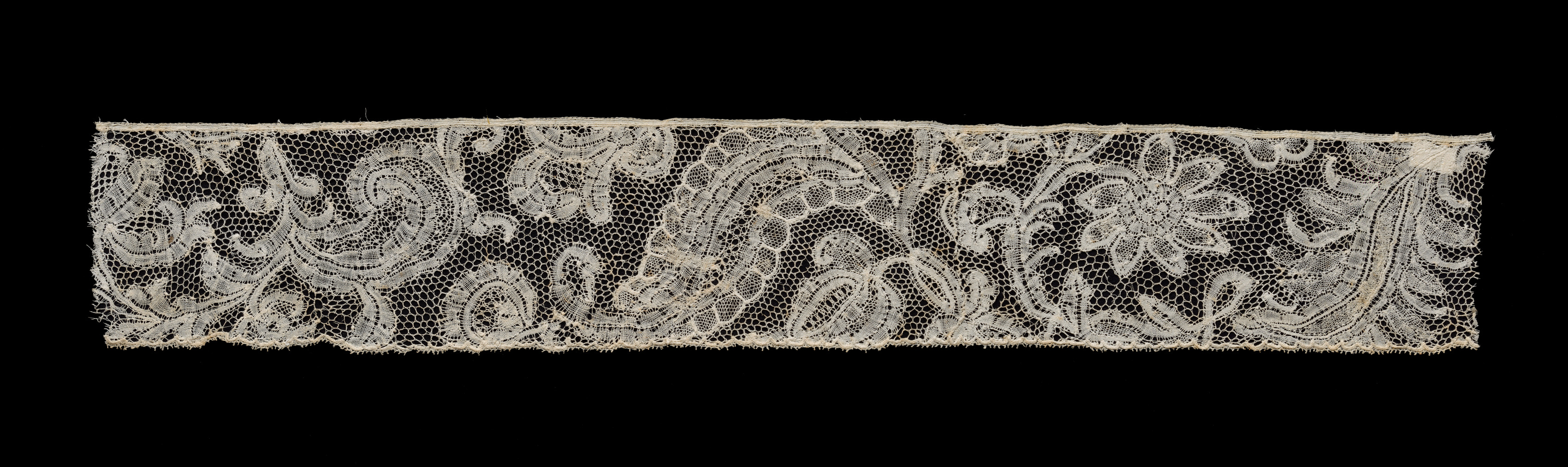 The image depicts a piece of bobbin lace edging. The edging is long and horizontal. The color is white and beige. The background of the lace is made up of a hexagonal netting pattern. The design on the lace features intricate floral and leaf patterns. The lace has a frayed edge on both the top and bottom. The background behind the lace is solid black. The lace appears to be made by the artist in a style that is characteristic of traditional lace-making techniques.