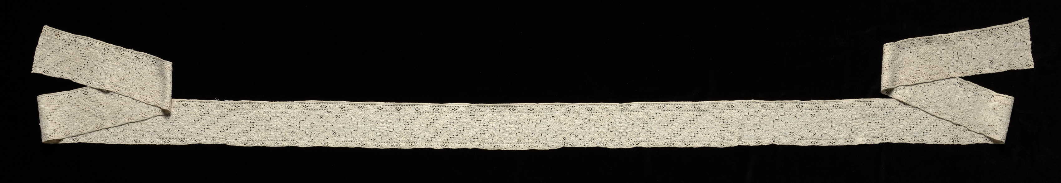 The Needlepoint (Cutwork) Lace Band by an unknown artist is a long, thin, off-white strip of fabric with a textured surface. The fabric has a repeating pattern of small holes and a grid-like design. The edges of the fabric are rough and uneven. The band is laid flat with the two ends folded back towards the top, resembling a ribbon or a strip of material. The background of the image is solid black.