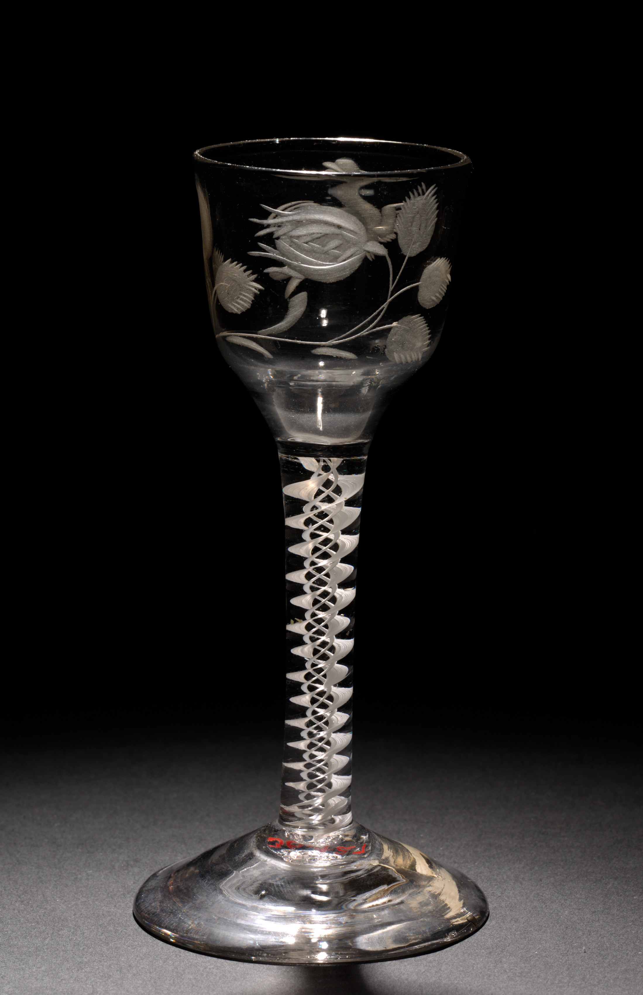 Clear glass wine glass with a wide mouth, slightly flared rim, and a long stem. The bowl of the glass features an etched floral design in a light color, with a prominent flower on the front, accompanied by leaves and stems. The stem is long and thin, with a series of oval shapes etched into it in a spiral pattern. The base of the glass is wide and flat. The background is black, with a gray surface that the glass is sitting on. The glass appears to have been created by Wine Glass.