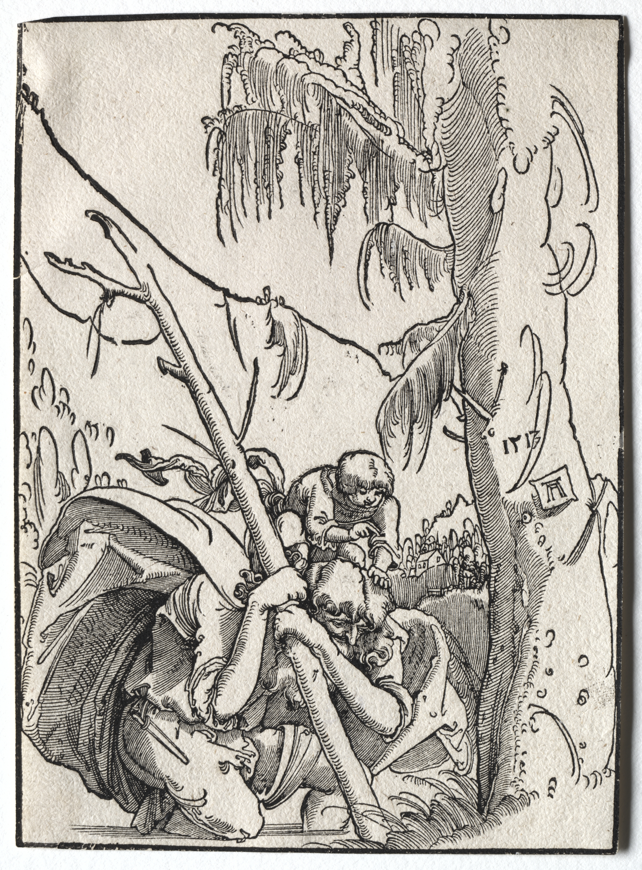 Black and white drawing of St. Christopher carrying a child across water on a tree branch. St. Christopher wears a hat, and a cape. He holds a long tree branch with one hand and grips the child's arm with the other. A crowd in the background stands on a distant shore. The tree extends from the bottom right corner to the top center. Water appears at the bottom right. The artwork is titled "St. Christopher" by Albrecht Altdorfer.