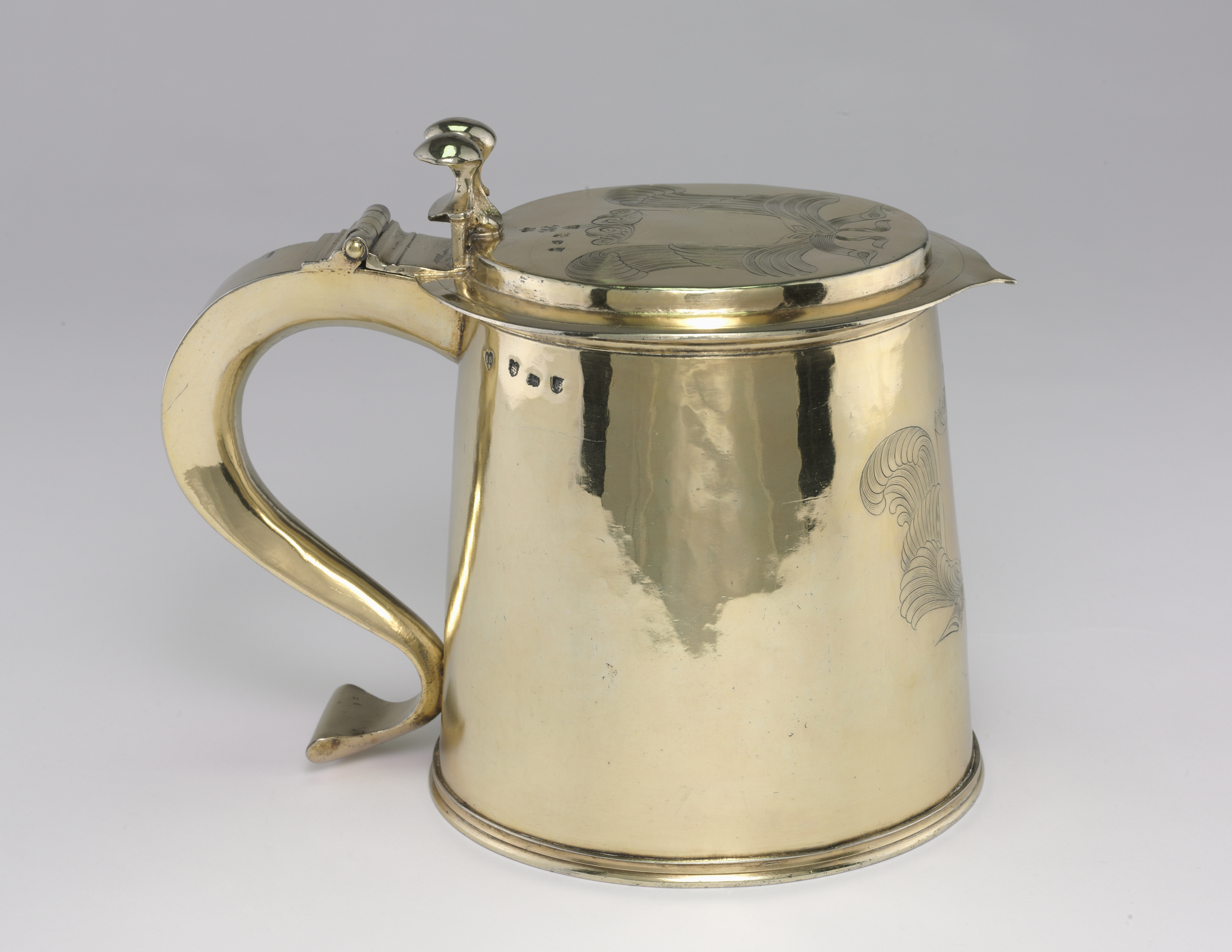 The Tankard by this artist is a shiny metal container with a cylindrical body that tapers slightly towards the top, a single curved handle on the left side, and a lid with a small finial on top. The lid and body feature engraved designs. The handle is attached to the body and lid with a small hinge. The base of the container has a slight lip around the edge. The background of the image is gray.