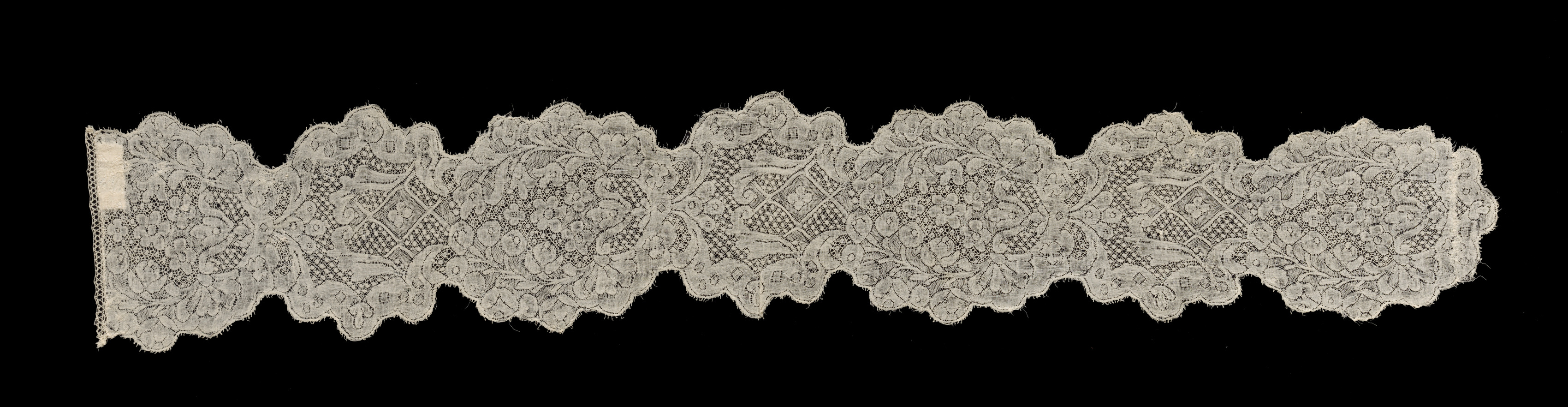 The Bobbin Lace Lappet by an unknown artist is a long, off-white piece of lace with intricate floral patterns and geometric designs. The lace has a scalloped edge on both sides, with one end featuring a straight edge with a fringe or tassel-like detail hanging down. The lace is made up of repeating sections with floral motifs, leaves, and geometric patterns. The background of the image is solid black, providing high contrast to the lace. The lace appears to be made of a delicate material, possibly thread or yarn, and has a vintage or antique appearance. The overall design is ornate and detailed, suggesting a high level of craftsmanship. The lace is presented in a horizontal orientation, with the straight edge with fringe on the left side.