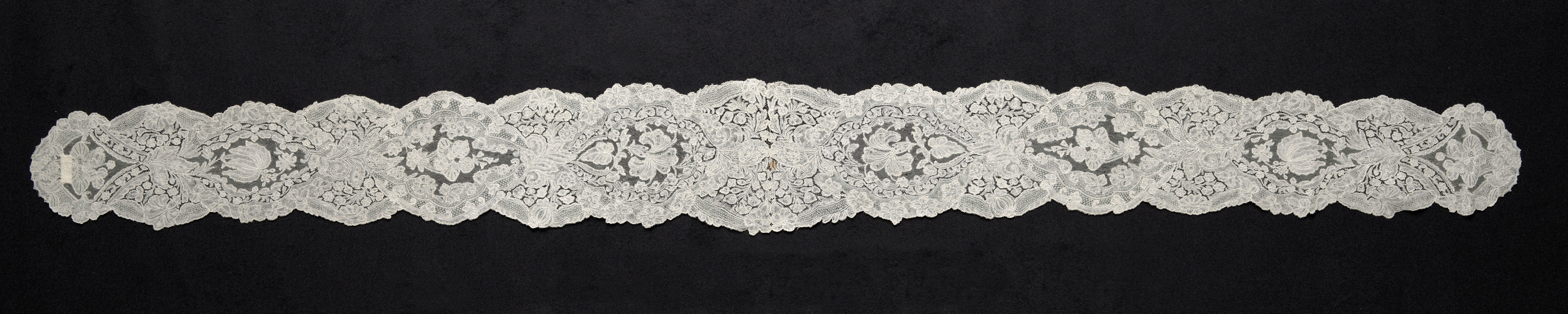 White bobbin lace lappet with scalloped edges, featuring intricate floral patterns and ornate details. The lace is composed of repeating sections with symmetrical designs, including flowers and foliage. The lace is set against a solid black background. The style is Point d'Angleterre.