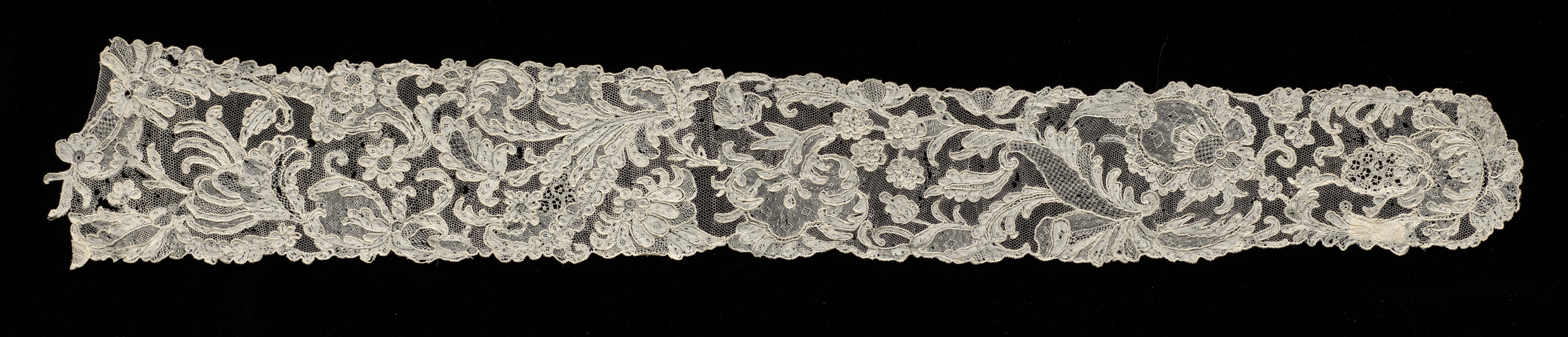 The Needlepoint Lace Lappet by an unknown artist features a long, off-white piece of lace against a black background. The lace is intricately designed with floral patterns and curved lines throughout. It has a scalloped edge along the top and bottom. The lace appears to be made of a delicate, thread-like material and is densely packed with ornate designs. The overall shape of the lace is long and narrow, with the top edge being slightly irregular. The lace is presented in a horizontal orientation.