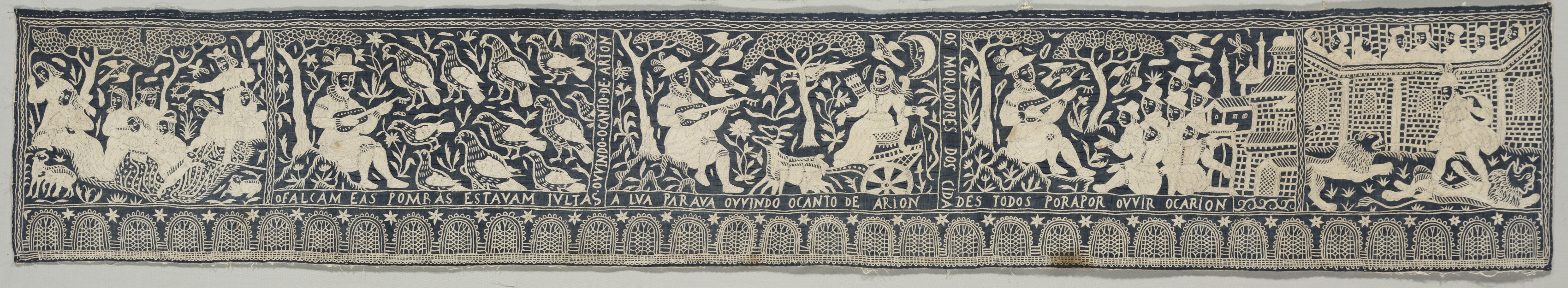 Rectangular textile with black and white design. The top section contains multiple scenes with various figures and animals in white on a black background, divided into sections by vertical lines of text. The bottom section features a repeating pattern of arches. The scenes depict people and animals, including trees, birds, and other creatures. The figures are shown engaging in activities such as playing instruments, interacting with each other and with animals. The text, written in white, appears to be a poem or lyrics by artist Arion, and is positioned vertically and horizontally along the length of the textile. The overall design is intricate and detailed, with a mix of natural and figurative elements. The title "Valence" is associated with this textile.