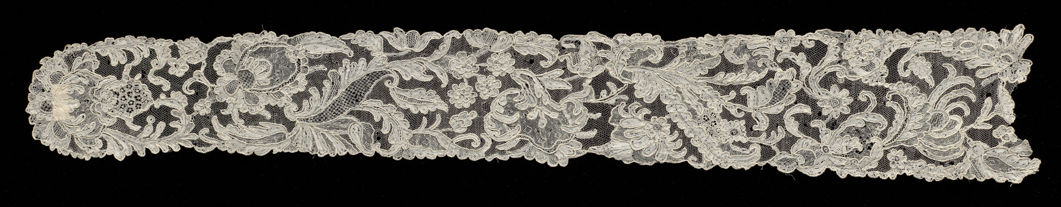 The Needlepoint Lace Lappet by an unknown artist is a long, white lace piece with an intricate floral design. The lace has a rectangular shape with a wavy edge along the top and bottom. The design features flowers, leaves, and scroll-like patterns throughout. The lace is made up of many small loops and stitches that form the intricate design. The background of the image is black, which provides a stark contrast to the white lace. The lace appears to be made of a delicate material, possibly thread or yarn. The overall design is symmetrical, with similar patterns on either side of the center. The lace has a vintage or antique appearance, suggesting it may be an older piece. The image presents the lace against a solid black background, allowing the viewer to focus on the details of the lace.