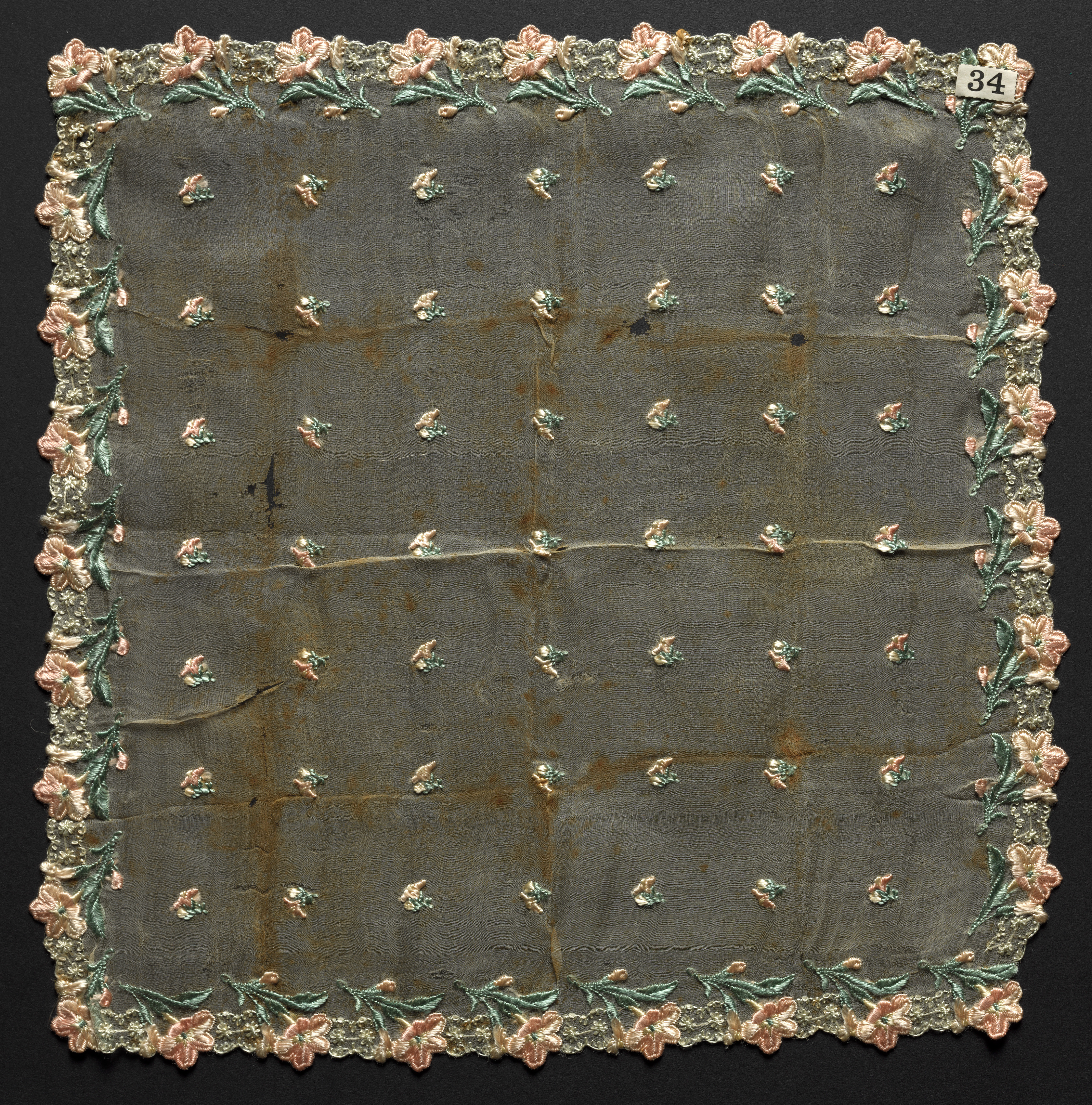 Square handkerchief by artist unknown titled "Handkerchief". Dark gray fabric. Bordered with green vines with light pink flowers. Scattered light pink flowers with green leaves on body. Wrinkled with light and dark patches throughout.