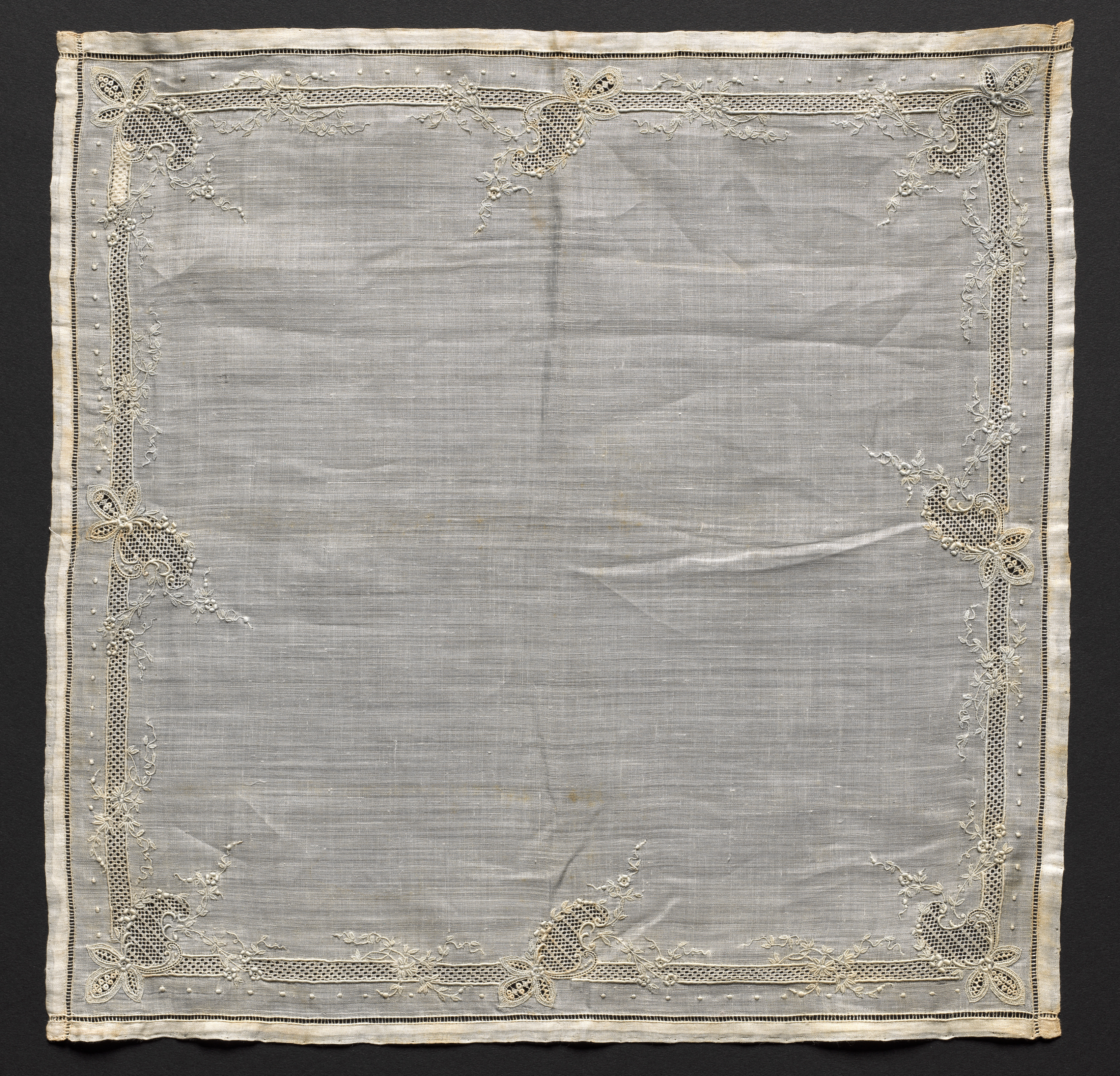 Embroidered Handkerchief by Unknown Artist. The image shows a square piece of fabric with intricate embroidery and a light-colored background. The fabric is light gray or off-white, with a slightly textured weave. The edges of the fabric are worn and frayed, with a thin border around the perimeter that is slightly darker than the rest of the fabric. The embroidery is a floral pattern with leaves and flowers. The embroidery is a lighter shade of the same color as the fabric, and features a repeating design of flowers and leaves along the edges of the fabric. The flowers have five petals and are arranged in a curved line, with leaves and stems connecting them. The embroidery is denser at the edges of the fabric, with a more open design in the center. The fabric appears to be wrinkled and slightly creased, with some darker spots and discoloration throughout. The background behind the fabric is solid black.
